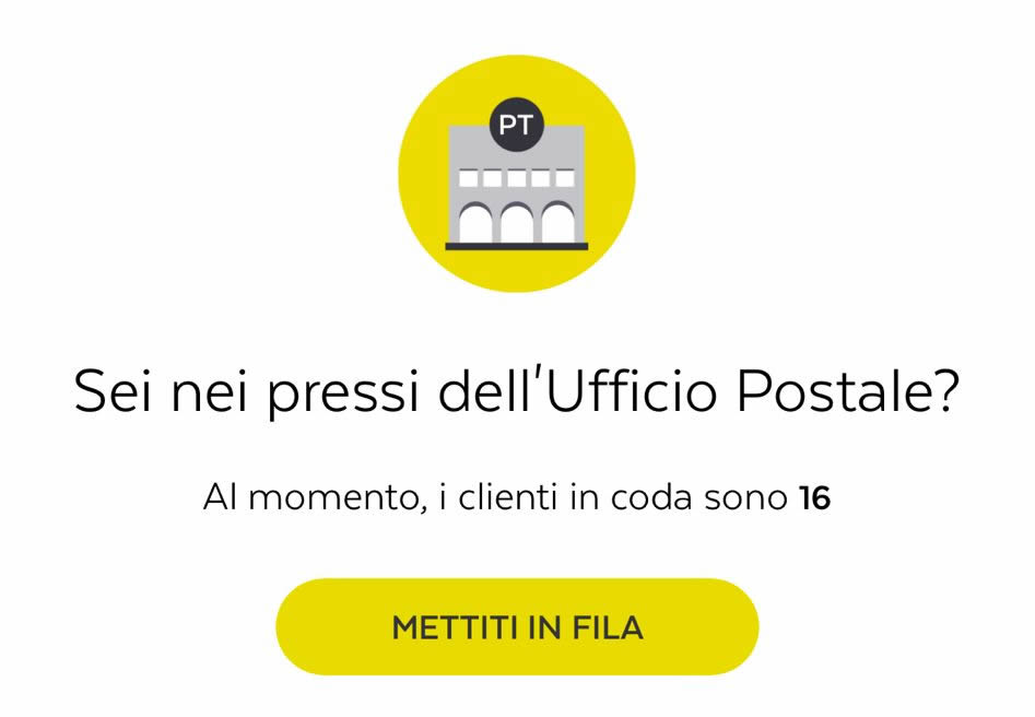 Nell’app “Ufficio Postale” è sufficiente individuare la sede di interesse, cliccare su “prenota ticket” e poi sul tasto “mettiti in fila”. Verrà automaticamente generato un numero di chiamata che comprende l’indicazione dei clienti in attesa in quel momento e dell’ultimo numero chiamato.