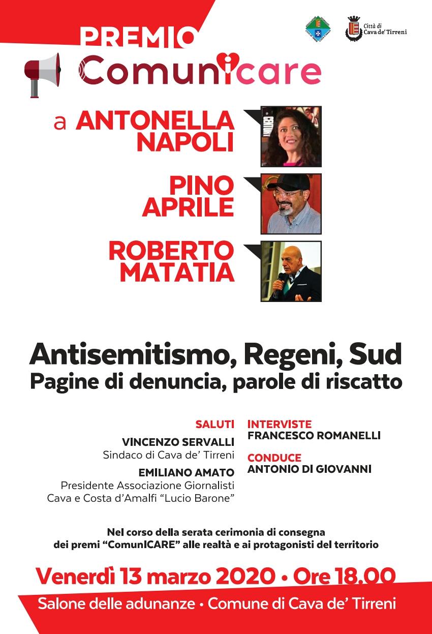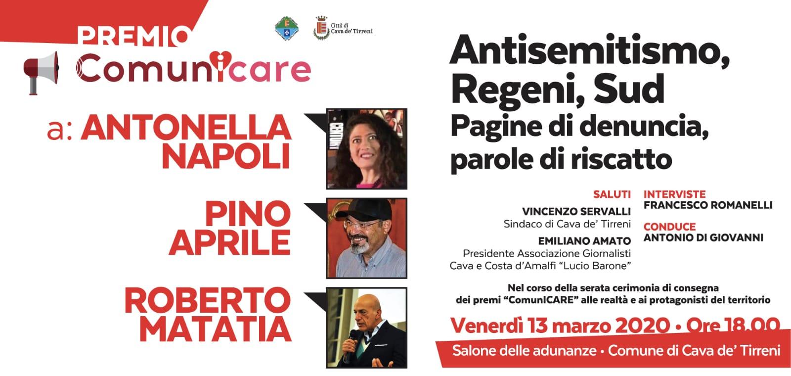 “Antisemitismo, Regeni, Sud: pagine di denuncia, parole di riscatto”: se ne discute venerdì 13 marzo a Cava de’ Tirreni con i giornalisti dell’Associazione Amalfi-Cava de’ Tirreni “Lucio Barone” nell’ambito dell’annuale appuntamento di “ComunIcare”, il premio all’informazione, alla comunicazione e alla diffusione culturale svolte con “cura”.