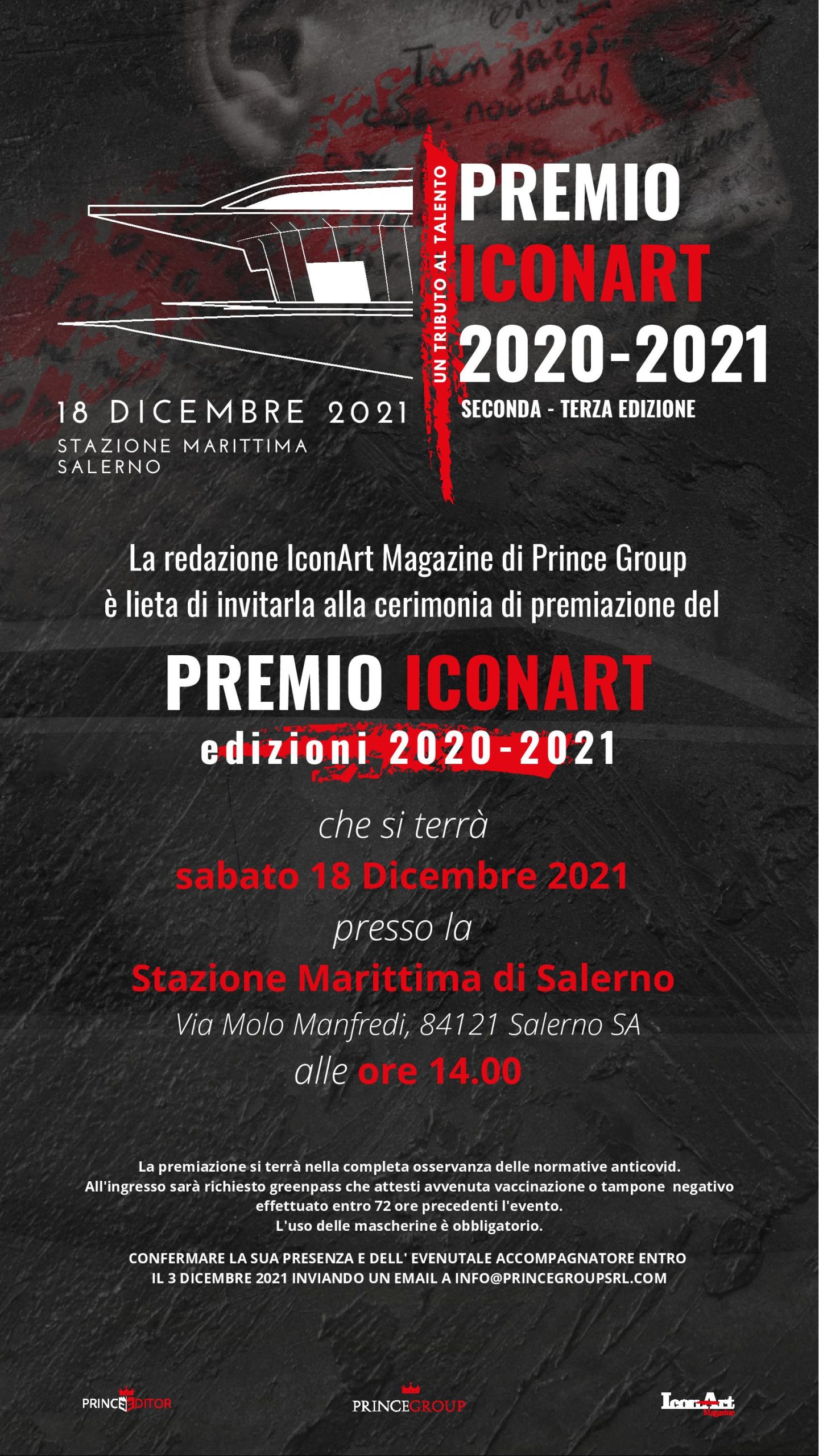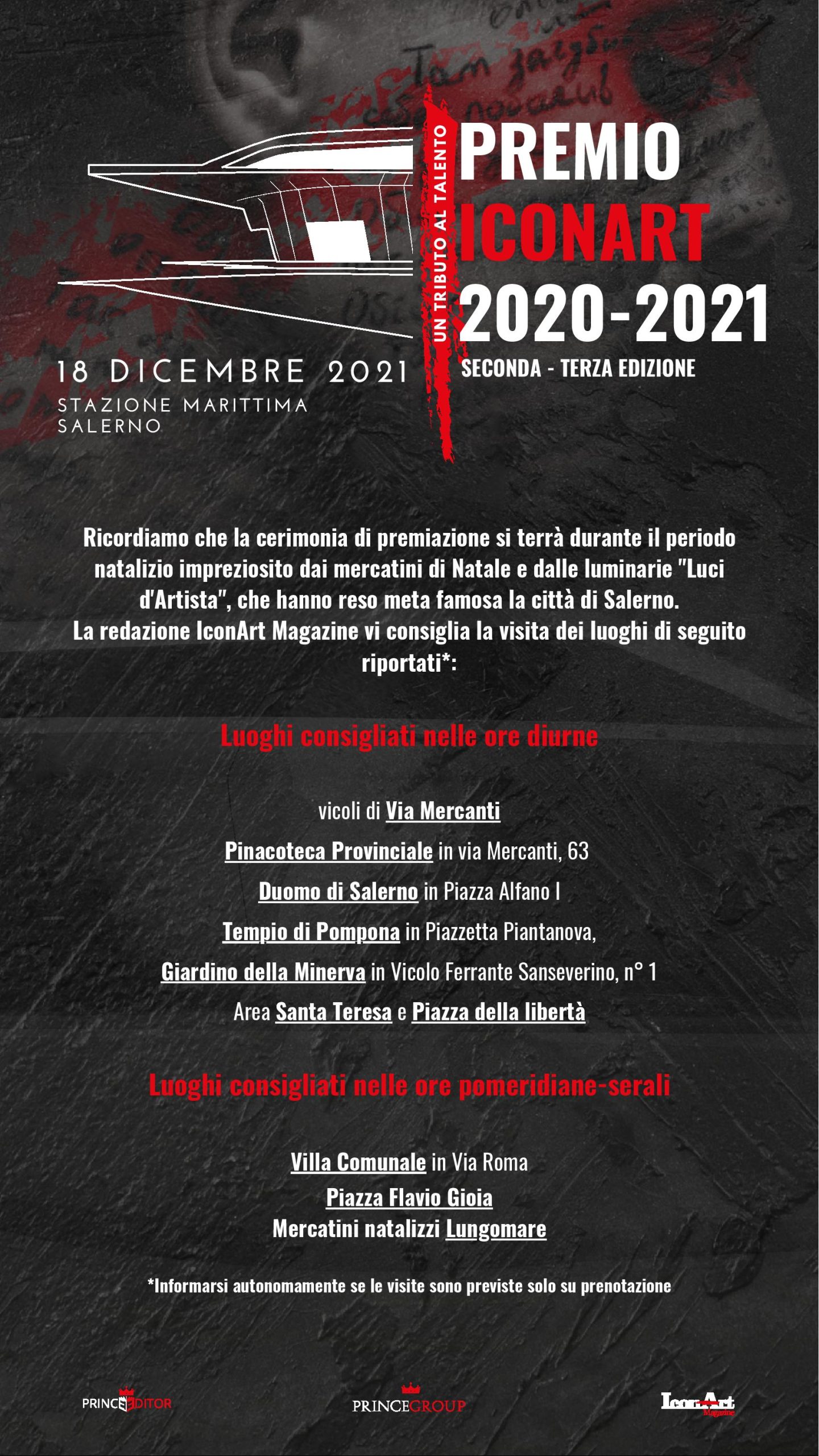 L’iniziativa – promossa da Prince Group e giunta alla sua terza edizione – si svolgerà sabato 18 dicembre. Quest’anno il progetto vede una duplice cerimonia di premiazione dal momento che quella prevista per il 2020 è stata precedentemente annullata per le restrizioni imposte dall’emergenza sanitaria. La manifestazione si terrà alla Stazione marittima di Salerno. Farà da corollario all’evento una mostra collettiva che sarà aperta al pubblico dalle ore 9 alle ore 18 e metterà in vetrina le opere degli artisti vincitori della mostra-premio “La Collettiva”.