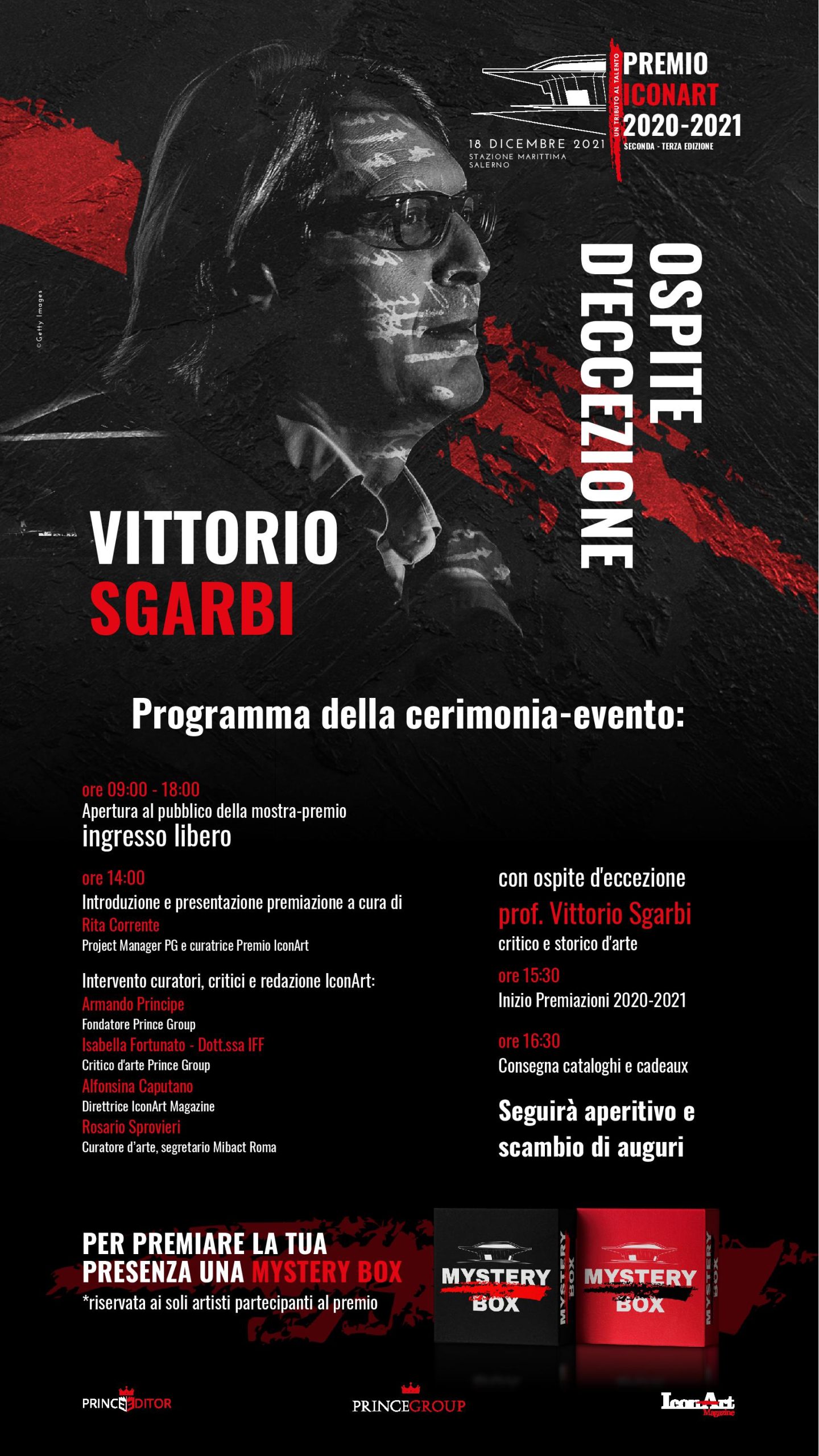 Alle ore 14 il critico e storico d’arte Vittorio Sgarbi interverrà come ospite d’eccezione durante l’evento e visiterà la mostra. Alle ore 15,30 avrà inizio la premiazione dell’edizione 2020 e 2021. Interverranno Armando Principe, Fondatore della Prince Group; Rosario Sprovieri, Curatore d’arte e Funzionario per la promozione e comunicazione del MiC di Roma e la redazione della rivista bimestrale IconArt Magazine, pubblicata da Prince Editor. L’iniziativa sarà presentata da Rita Corrente, Project Manager Prince Group e curatrice del Premio IconArt.