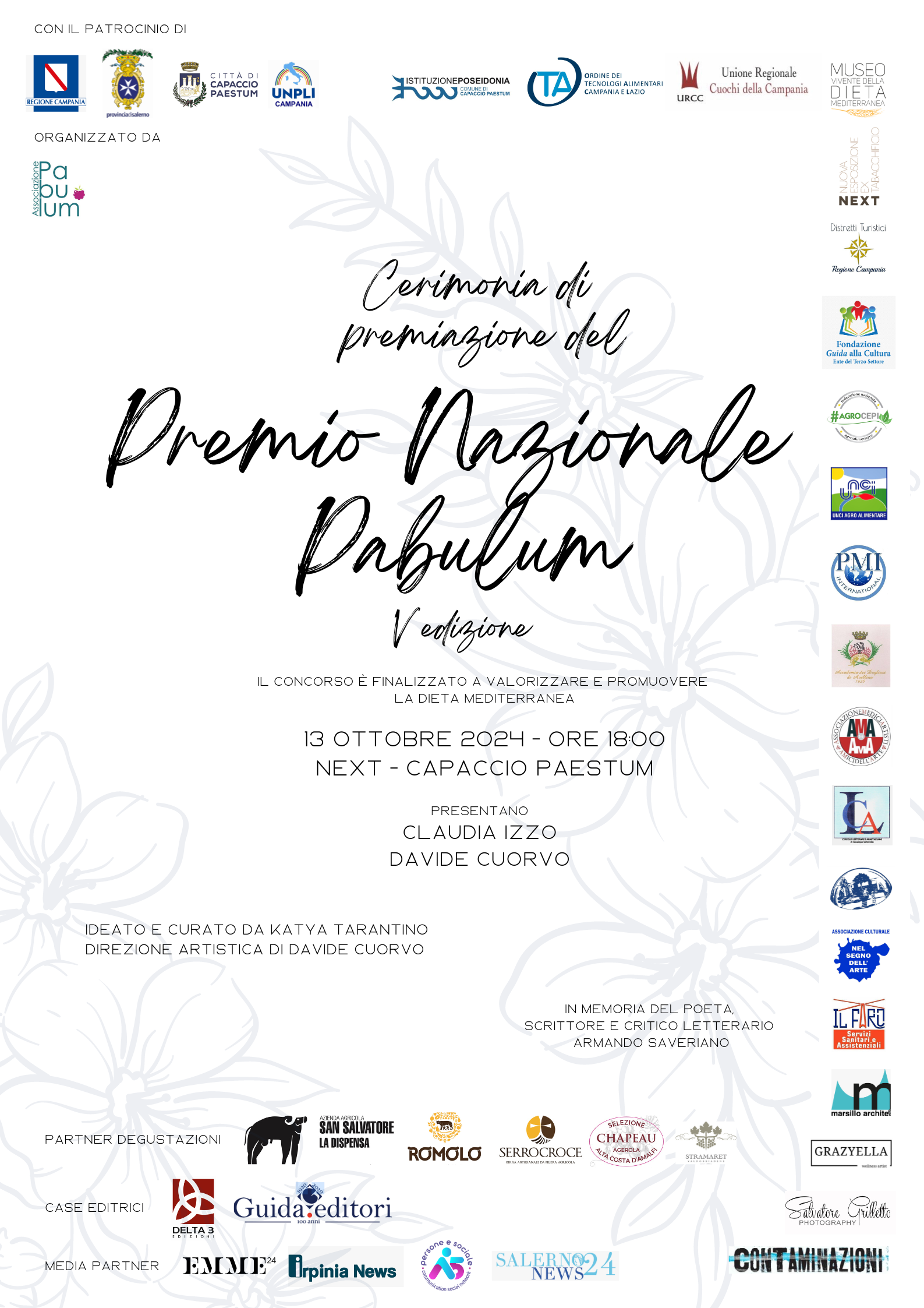 Domenica 13 ottobre alle ore 18:00, nella sala conferenze (ex Basilica) del NEXT di Paestum avrà luogo la cerimonia di premiazione della V edizione del Premio Nazionale Pabulum, la prestigiosa iniziativa ideata e curata da Katya Tarantino, biologa nutrizionista e Presidente dell’associazione Pabulum.