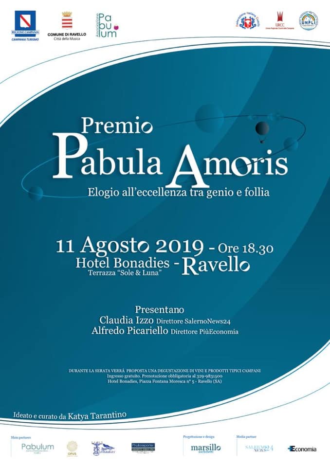 Domenica 11 agosto a Ravello, la città della musica, avrà luogo la cerimonia di premiazione del Premio Pabula Amoris, la prestigiosa manifestazione ideata e curata da Katya Tarantino, Biologa Nutrizionista e Presidente Associazione Pabulum. L’iniziativa ha ricevuto i Patrocini morali dell’Agenzia Regionale per la Promozione del Turismo della Campania, del Comune di Ravello, della Federazione Italiana Cuochi, Unione Regionale Cuochi della Campania, UNPLI Salerno ed ha come partner UNCI Agroalimentare, AGROCEPI, PMI International, Distretti Turistici della Campania.