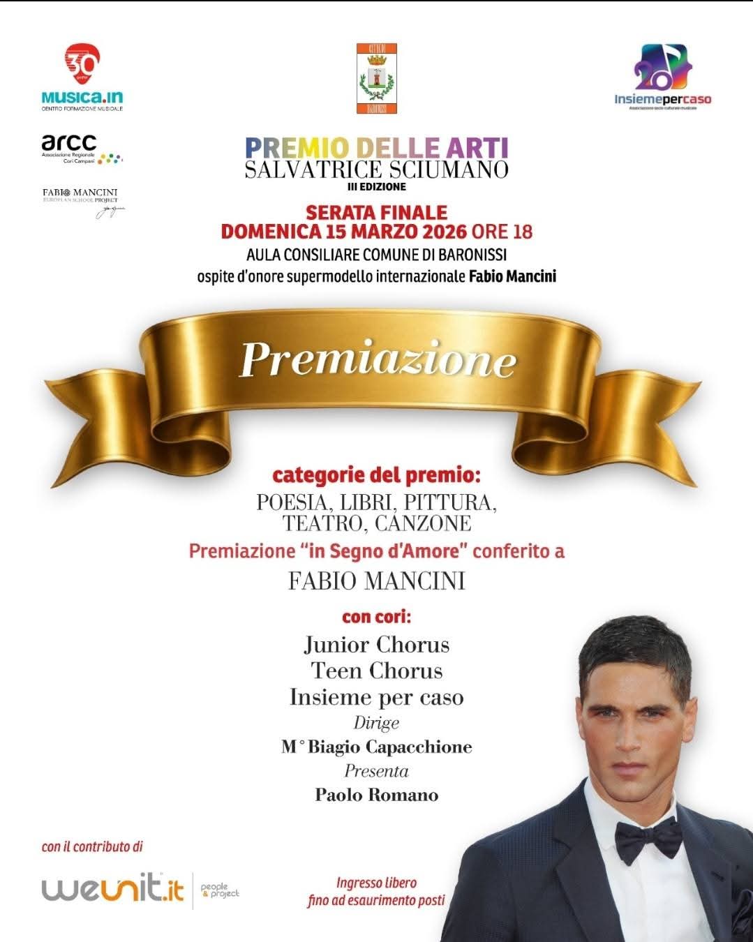 E’ il caso di un Top Model famosissimo  che ha sfilato venti anni per  Giorgio Armani e  che  si dedica  ad un progetto davvero  speciale “Sogni in cammino”:  Lui è Fabio Mancini, ospite di questa terza edizione del Premio  delle Arti “Salvatrice Sciumano”, promossa dall’associazione socio-culturale e musicale “Insieme per Caso”.