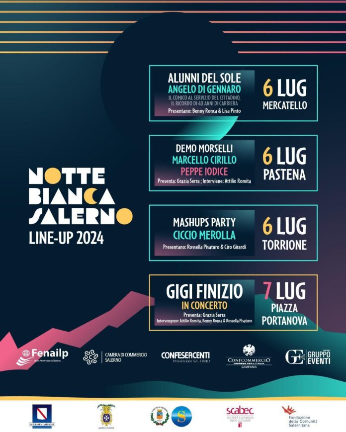 La XII edizione della Notte Bianca di Salerno, grande evento di musica e spettacolo, in programma in quattro piazze di Salerno sabato 6 e domenica 7 luglio, è organizzato dalla Fenailp, Federazione Nazionale Autonoma Imprenditori e Liberi Professionisti, con il Patrocinio di Regione Campania, Provincia di Salerno, Comune di Salerno, Camera di Commercio di Salerno, , Scabec e Fondazione della Comunità Salernitana, con la collaborazione di Confcommercio e Confesercenti.