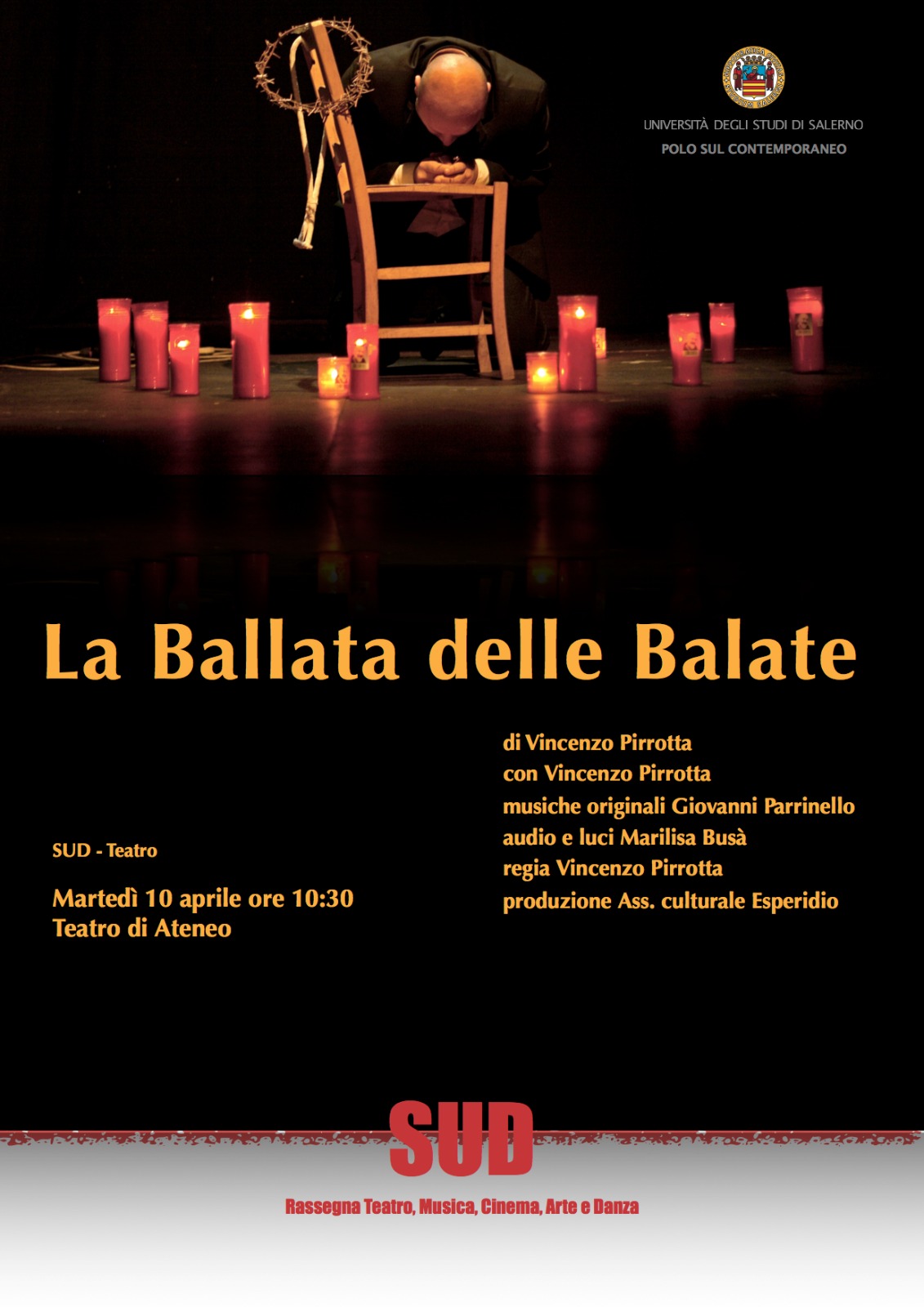 La Rassegna nasce per consolidare la riflessione ampia ed articolata che l’Università di Salerno dedica da tempo allo studio del contemporaneo. Il primo appuntamento del percorso culturale di “SUD” è domani martedì 10 aprile, alle ore 10.30, in Teatro di Ateneo con lo spettacolo “La Ballata delle Balate”, curato dal drammaturgo, regista e attore siciliano Vincenzo Pirrotta.