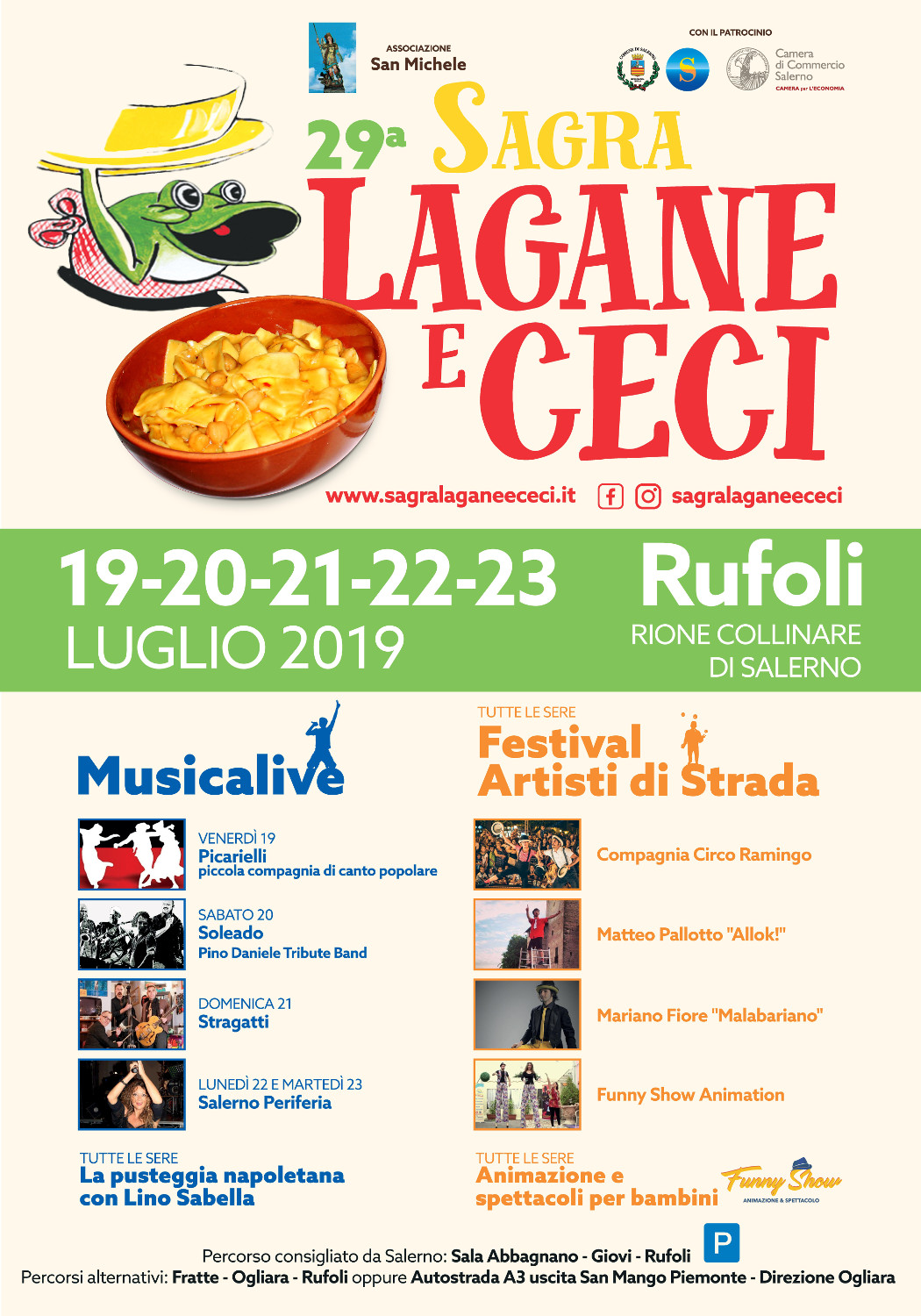 5 serate, 5000 mq suddivisi tra stand gastronomici, aree intrattenimento e spettacolo, 4 tra i migliori gruppi del panorama musicale campano, decine di artisti di strada. Questi sono solo alcuni dei numeri del 29esima edizione della Sagra Lagane e Ceci in programma dal 19 al 23 luglio 2019 nella frazione collinare Rufoli di Salerno. L’appuntamento gastronomico della tradizione salernitana, che negli anni ha saputo trasformarsi in un vero evento di aggregazione per l’intera provincia, continua ad essere possibile grazie all’impegno dell’associazione “San Michele” e alla Parrocchia San Michele Arcangelo di Rufoli e Sant’Angelo, forte anche del patrocinio del Comune di Salerno e di quello della Camera di Commercio.
