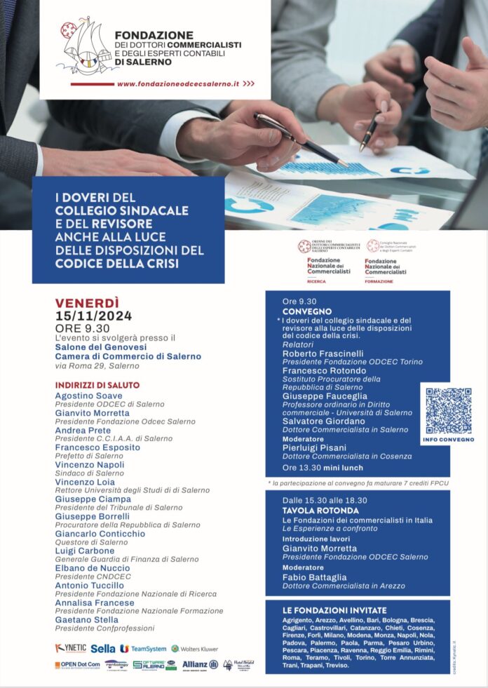 Si entrerà poi nel merito tecnico con il convegno dal titolo “I doveri del collegio sindacale e del revisore alla luce delle disposizioni del Codice della Crisi” dove interverranno il presidente della Fondazione ODCEC di Torino Roberto Frascinelli, il Sostituto Procuratore presso il Tribunale di Salerno Francesco Rotondo, il professore di Diritto Commerciale presso l’UniSA Giuseppe Fauceglia, il dottore commercialista Salvatore Giordano; modera il dottore commercialista Pierluigi Pisani. La sessione pomeridiana prevedrà invece una Tavola Rotonda, moderata da Fabio Battaglia Dottore Commercialista in Arezzo, in cui le varie Fondazioni dei commercialisti in Italia, tra cui quella di Milano, Torino, Roma, Napoli, Bologna, Piacenza e tante altre, dialogheranno sulle proprie esperienze.