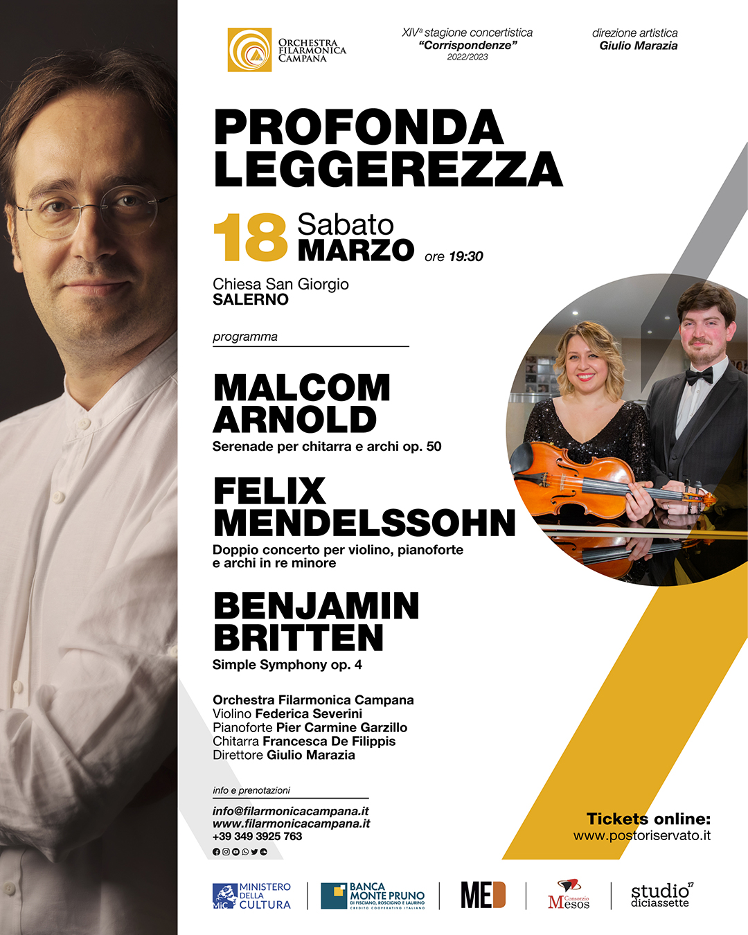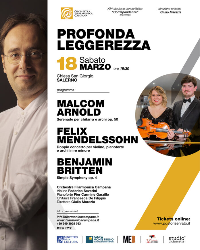 Riprendono i concerti della Stagione 22/23 dell’Orchestra Filarmonica Campana con l’ottavo appuntamento del cartellone programmato nella chiesa barocca più bella di Salerno, ovvero quella di San Giorgio, nel cuore di via Mercanti e via Duomo. Il concerto denominato“Profonda Leggerezza” si terrà il 18 Marzo alle ore 19.30 (prevendita biglietti su postoriservato.it) e il programma scelto vede protagonisti tre compositori di altrettante epoche diverse legati fra loro da caratteristiche quali la grande chiarezza formale e la straordinaria semplicità melodica in contrapposizione a slanci impetuosi di grande sensibilità ed equilibrio strutturale. In apertura ascolteremo la Serenade per chitarra e orchestra d’archi di Malcom Arnold che sarà interpretata da Francesca De Filippis. Nella produzione del compositore americano le inevitabili influenze di autori del passato, tra cui H. Berlioz, vengono rielaborate e integrate in un linguaggio personale, che non disdegna il confronto con il jazz e le tradizioni folcloriche. Sebbene spesso basate su tecniche compositive complesse, le sue opere sono prevalentemente scritte per essere di gradevole ascolto e accessibili a un pubblico vasto.