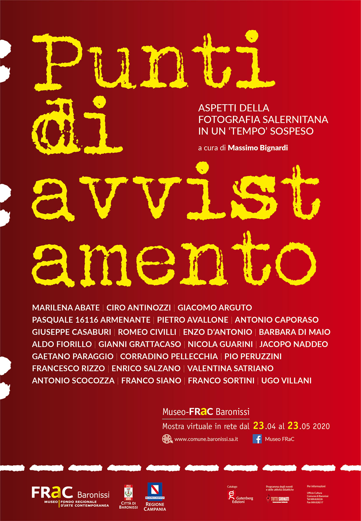“Il FRaC Baronissi – scrive Gianfranco Valiante sindaco di Baronissi –, una struttura che da decenni si è fatta riconoscere in campo regionale e, con proiezioni sul piano nazionale, anche se ha chiuso i suoi ‘battenti’ fisici, non ha smesso il suo ruolo di ricerca e promozione degli artisti e delle situazioni vive nell’area provinciale e regionale. La mostra che oggi apre virtualmente i battenti, ricorrendo alle vie dell’etere, è dedicata ad aspetti della fotografia presente oggi nell’area salernitana. Non è un punto chiuso, bensì una prima indagine sul campo, che vede gli artisti invitati a riflettere sul tema di questo “tempo sospeso”. Il risultato è carico di entusiasmo sia perché le opere in mostra respirano l’aria dei giorni che viviamo, sia perché risponde alla ferrea volontà di continuare a tenere aperta, in senso virtuale, un laboratorio di idee, un presidio culturale”.