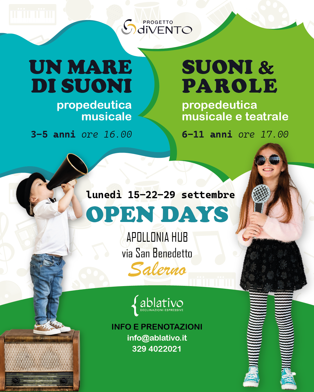 Partono il 15 settembre a Salerno gli Open Day gratuiti dei percorsi educativi e formativi promossi da Ablativo – associazione culturale ETS. Le attività si svolgeranno negli spazi dell’Ex Chiesa di Sant’Apollonia, nel cuore del centro storico. Da ottobre 2025 ad aprile 2026 i laboratori di teatro e musica accompagneranno bambini, ragazzi e adulti in un percorso settimanale di crescita e sperimentazione attraverso i linguaggi artistici, con una prima restituzione a dicembre e un lavoro finale di gruppo in primavera.