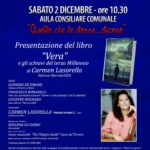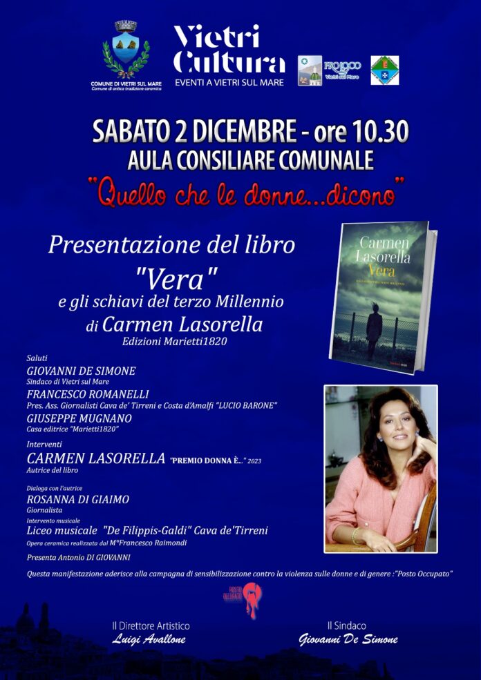 Sabato 2 dicembre , nella Sala del Consiglio del Palazzo di Città di Vietri sul Mare, con inizio alle 10.30, secondo appuntamento con la rassegna “Quello che le donne… Dicono!”, organizzata dal Comune di Vietri sul Mare, nella persona del giornalista Antonio Di Giovanni, nell’ambito delle manifestazioni culturali “Vietri Cultura”, per la direzione artistica di Luigi Avallone e incentrata sulle produzioni letterarie e creative al femminile, con il patrocinio dell’Associazione Giornalisti Cava de’ Tirreni e Costa d’Amalfi “Lucio Barone” e della Proloco di Vietri sul mare. Sarà la giornalista Carmen Lasorella a presentare il suo ultimo lavoro letterario ” Vera e gli schiavi del Terzo Millennio” (ed. Marietti1820)