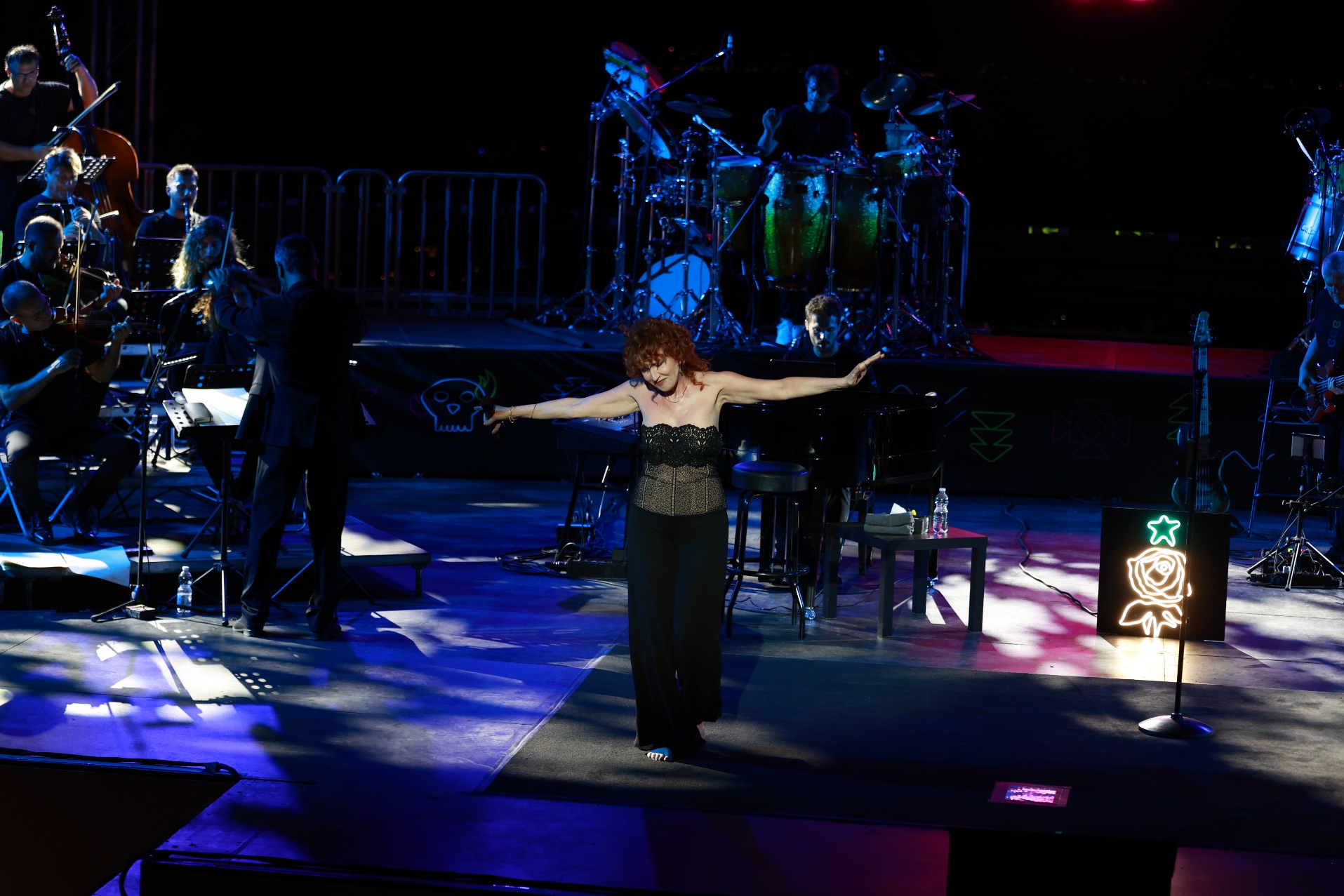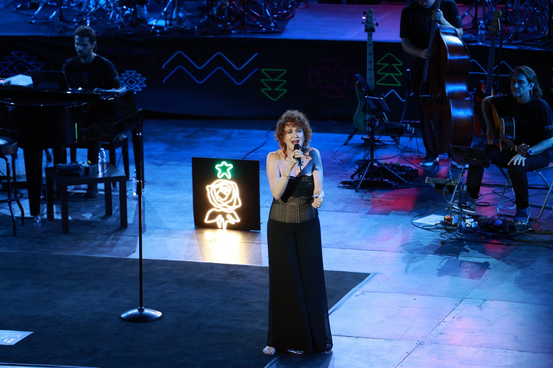 Accompagnata dai 21 elementi dell’Orchestra Saverio Mercadante diretta dal Maestro Rocco De Bernardis e da Carlo Di Francesco e Raul Scebba alle percussioni, Sebastiano Burgio al pianoforte, Pierpaolo Ranieri al basso e contrabasso e Massimiliano Rosati alle chitarre, ha incantato e fatto cantare per più di due ore la platea gremita in ogni ordine di posto del Ravello Festival.