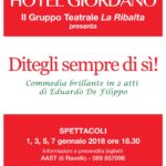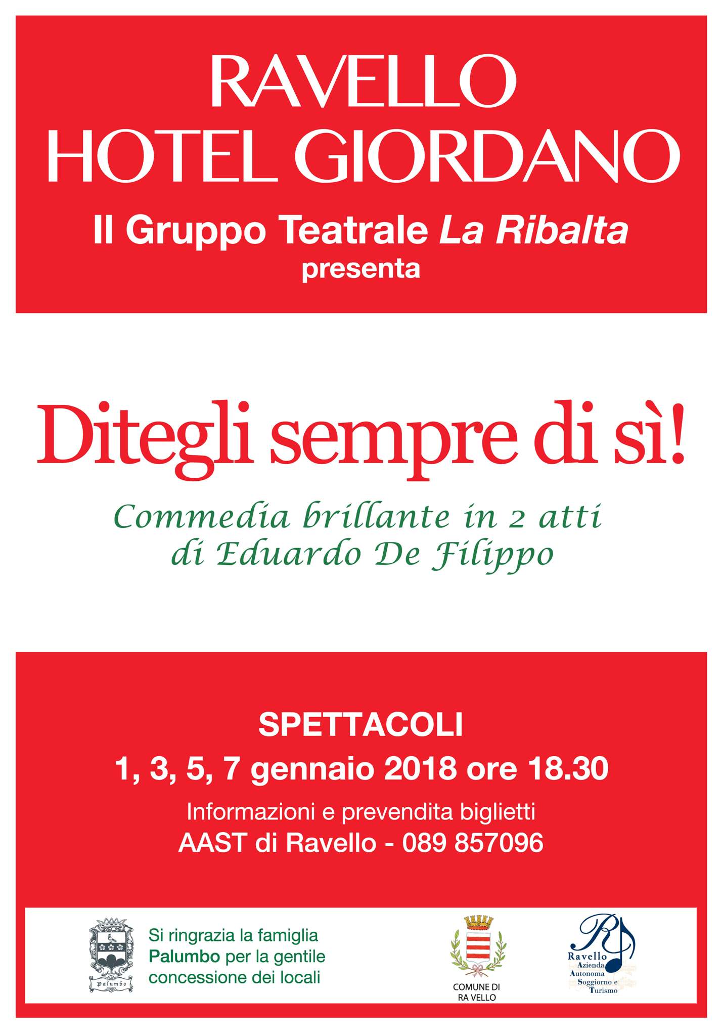 Non è Natale a Ravello senza il teatro e senza La Ribalta. Lo storico gruppo, per il quarantaduesimo anno consecutivo, apre il sipario e quest’anno lo fa in grande stile, mettendo in scena una delle commedie più fortunate della produzione edoardiana: Ditegli sempre di sì!. Ad inaugurare la stagione però, saranno i giovani attori de La Ribalta Off. Il gruppo, frutto dell’esperienza del Laboratorio “Franco Lucibello”, porterà in scena, il 27 e 28 dicembre prossimi (ore 18.30), Delitto d’onore fu, commedia liberamente tratta da un’opera di G. Di Maio.  Location di tutte le repliche, per il secondo anno consecutivo, la sala dell’Hotel Giordano.
