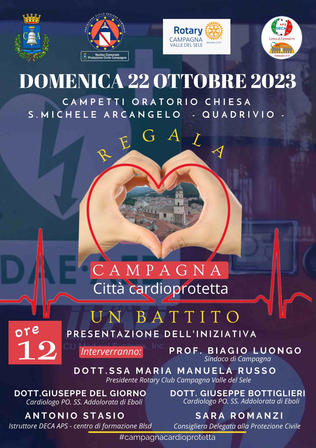 Il Comune di Campagna attraverso il suo Nucleo Comunale di Protezione Civile, con la collaborazione del Centro di Formazione BLSD – “DECA SPORT PER TUTTI” e con il partenariato del Rotary Club CAMPAGNA Valle del Sele, domenica 22 ottobre illustrerà alle ore 12, presso i campetti dell’oratorio della Chiesa di S. Michele Arcangelo al Quadrivio, l’iniziativa: “REGALA UN BATTITO”.