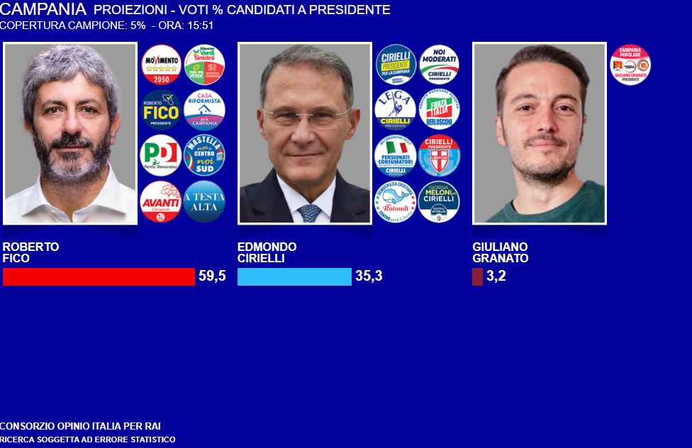 Con una copertura del campione del 5%, alle elezioni regionali in Campania il candidato del campo largo Roberto Fico è al 59,5% mentre il candidato del centrodestra Edmondo Cirielli è al 35,3%.