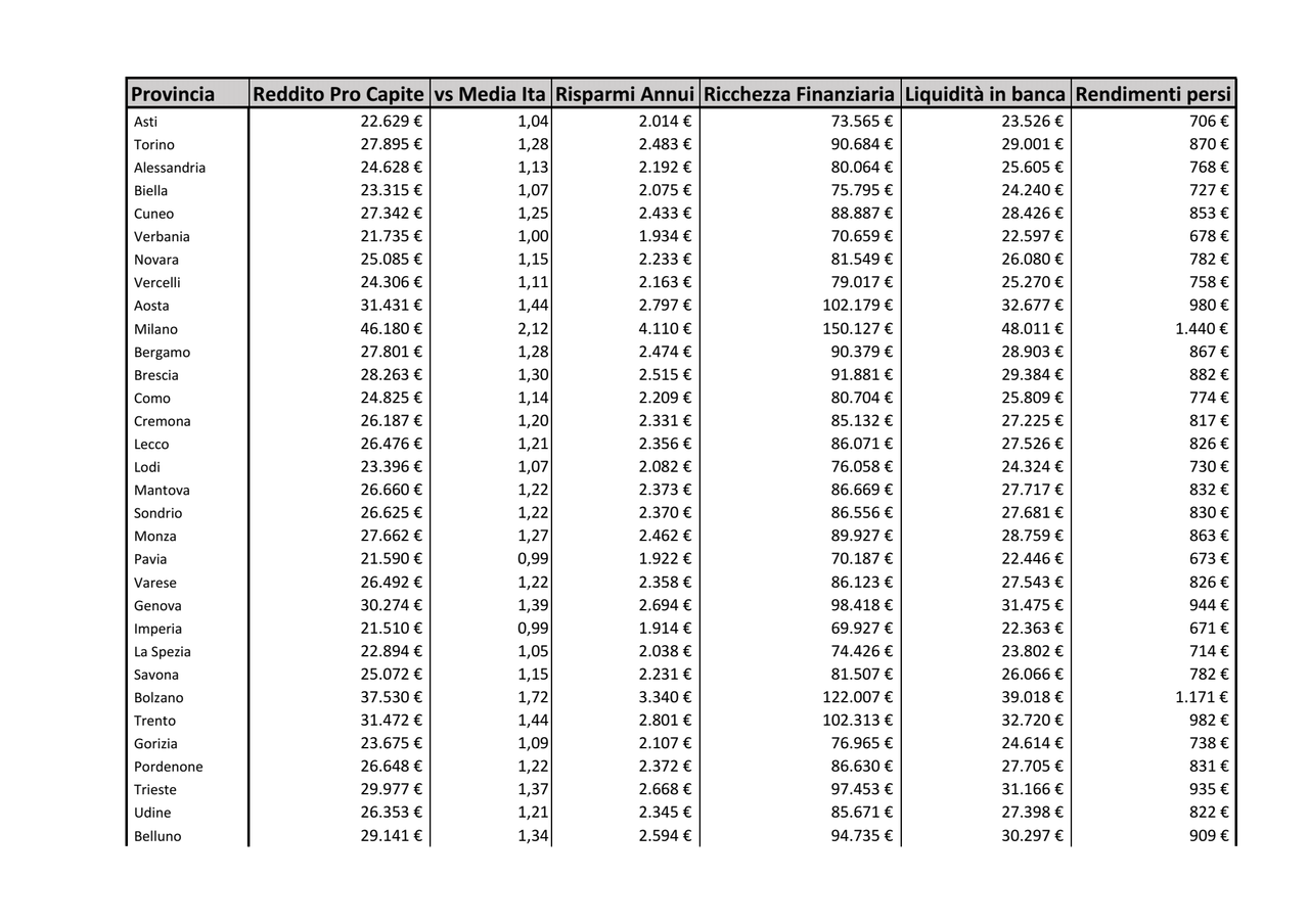 I dati riguardano tutte le province italiane e mettono a fuoco uno scenario basato sulla relazione tra il reddito pro capite, la capacità di risparmio dei cittadini, i depositi in banca e gli investimenti.