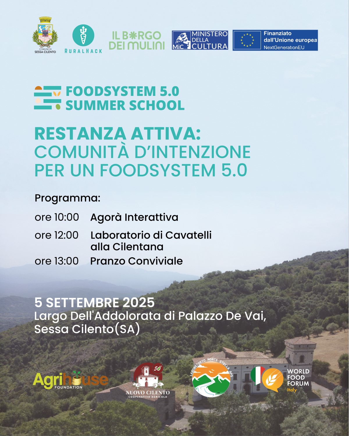 La Summer school di FoodSystem 5.0 fa parte di un ciclo delle 4 school stagionali sul FoodSystem 5.0 che si inserisce all’interno del progetto di rigenerazione culturale e sociale il Borgo dei Mulini promosso dal Comune di Sessa Cilento,