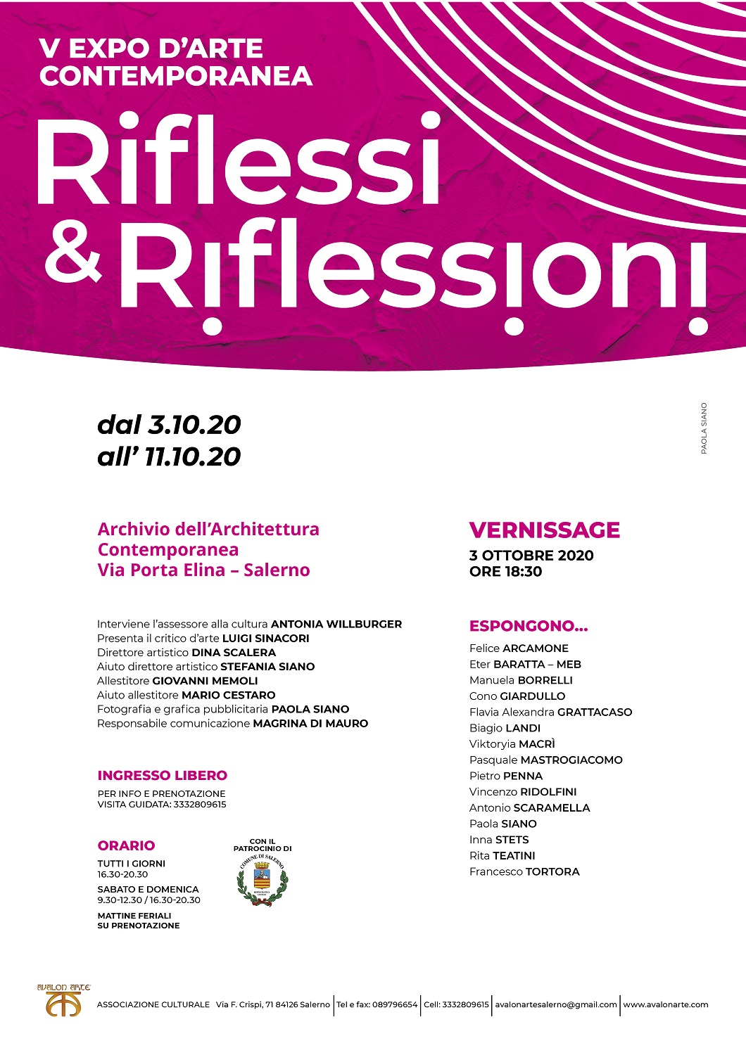 Nel pieno rispetto delle norme anti covid, dal 3 all’11 ottobre presso l’Archivio dell’Architettura Contemporanea in Via Porta Elina a Salerno si terrà la quinta edizione della Expo d’Arte Contemporanea “Riflessi e Riflessioni”.