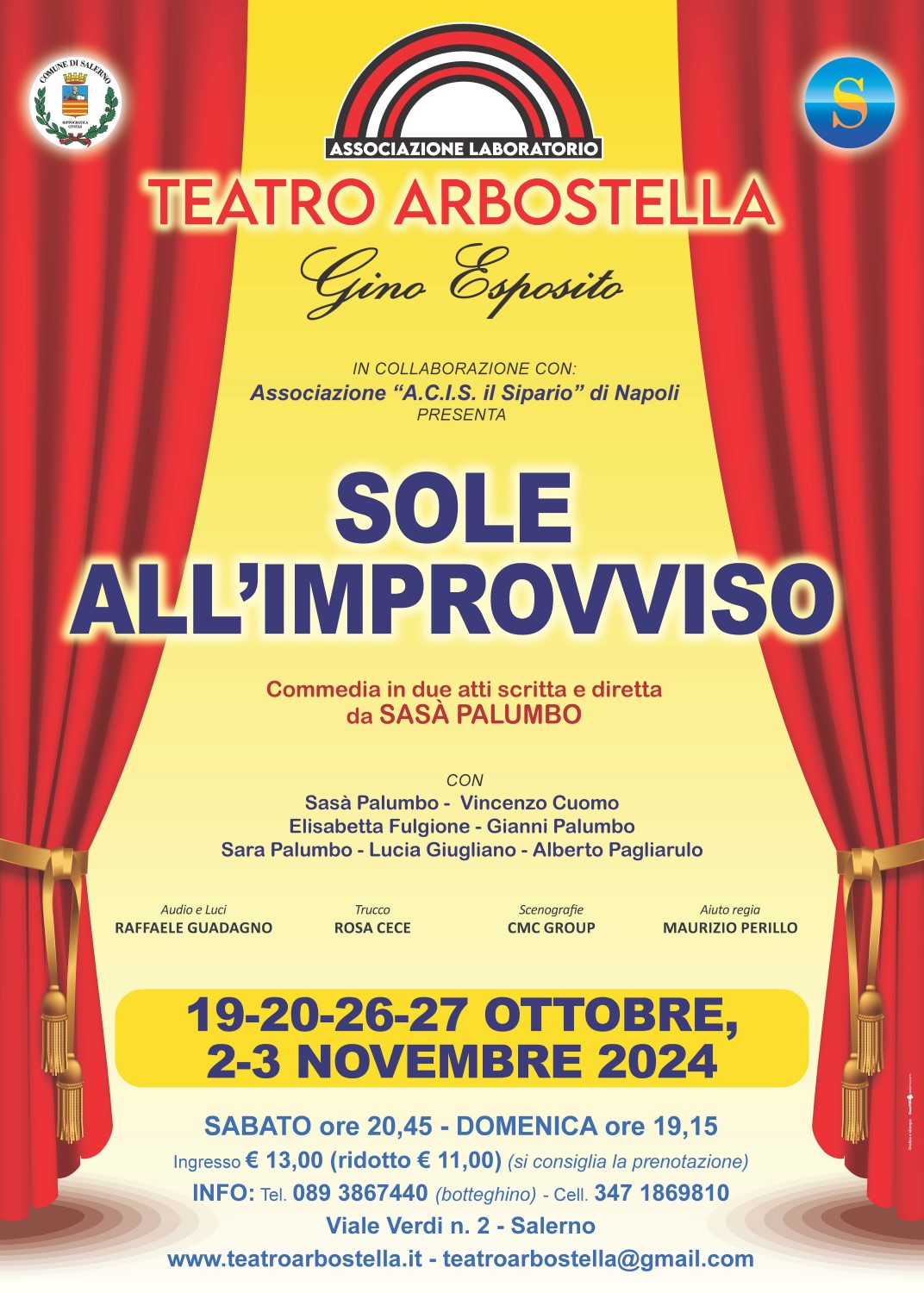 Per il secondo appuntamento della XVII stagione teatrale ecco l’attesissimo Sasà Palumbo, altro volto ormai storico del cartellone firmato Esposito-Caracciuolo. Palumbo con la sua compagnia ACIS il Sipario di Napoli si sta cimentando in uno dei suoi testi con il quale ha avuto molti riconoscimenti in ambito regionale e nazionale. Stiamo parlando della commedia “SOLE ALL’IMPROVVISO”, scritta diretta e interpretata dallo stesso Sasà Palumbo e arricchita da altri validi attori. Una pièce dei giorni nostri dove viene trattato con leggerezza ma anche con emotività uno dei temi più scottanti del nostro territorio.