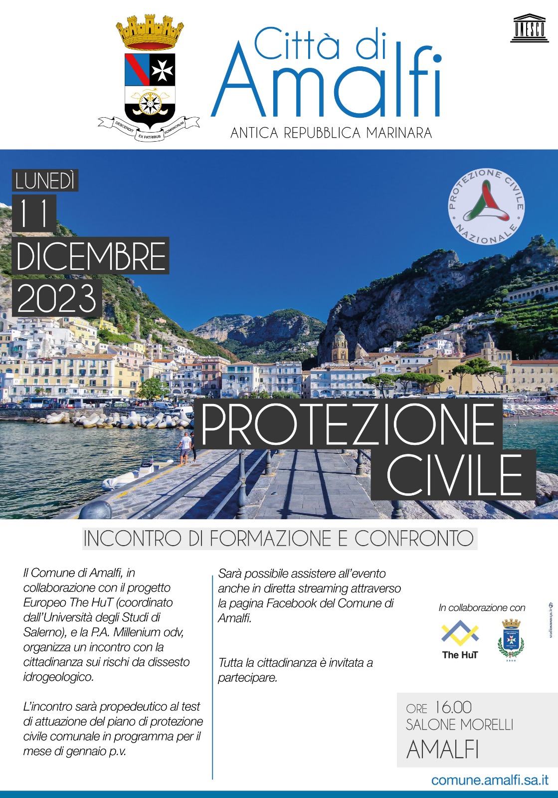 L’evento, in programma alle ore 16 presso il Salone Morelli, è promosso in collaborazione con il progetto Europeo The HuT (coordinato dall’Università degli Studi di Salerno), e la Pubblica Assistenza Millenium associazione di volontariato impegnata nelle attività di Protezione Civile in Costa d’Amalfi.