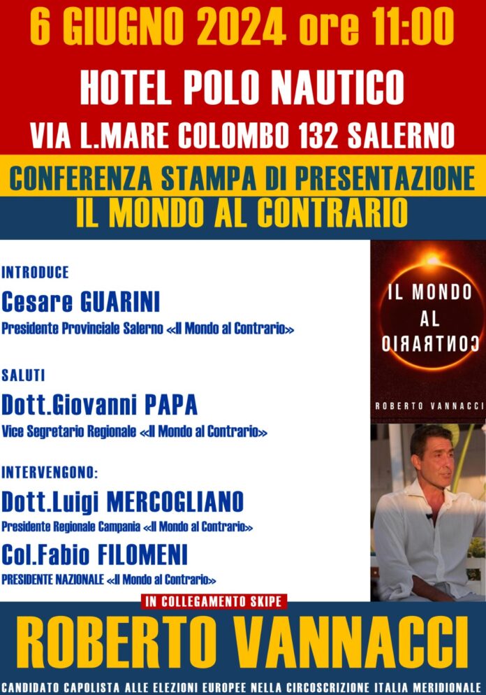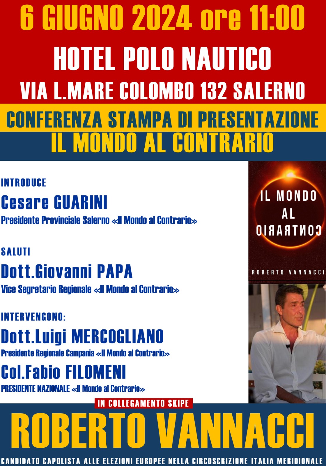 All’evento interverranno: Cesare Guarini, Presidente Provinciale “Il Mondo al Contrario”; Dott. Giovanni Papa, Segretario “Iniziativa Meridionale”; Dott. Luigi Mercogliano, Presidente regionale Campania “Il mondo al contrario” e Col. Fabio Filomeni, Presidente Nazionale “Il mondo al contrario” nonché fondatore dello stesso Comitato. Nel corso della conferenza stampa, il Generale Roberto Vannacci sarà collegato online per rispondere alle domande dei giornalisti sul suo libro e sulla candidatura come capolista alla circoscrizione Italia Meridionale, alle prossime Elezioni Europee del 8 e 9 giugno.
