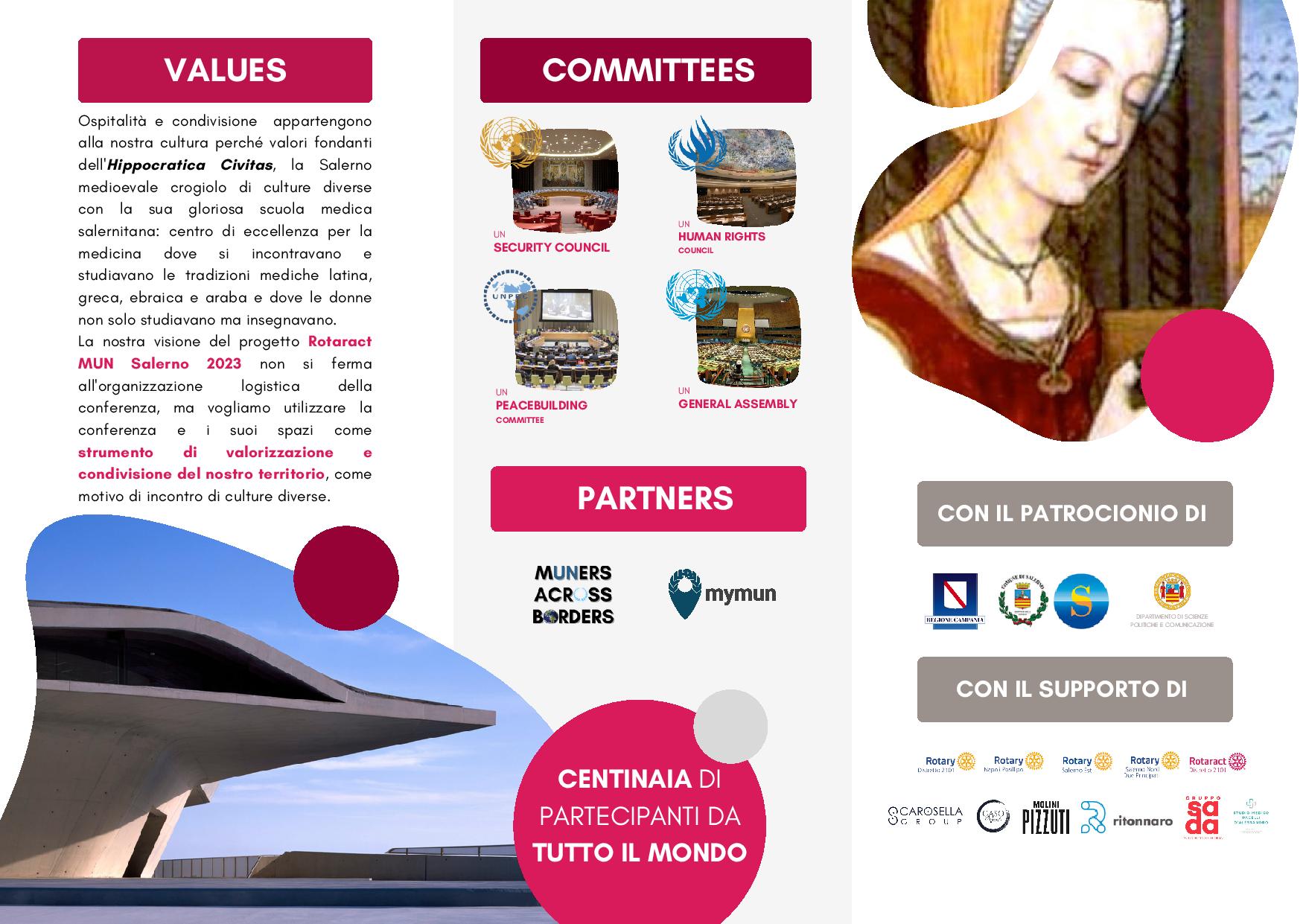 Il successo del Rotaract MUN Salerno 2023 è stato reso possibile grazie alla collaborazione di diverse organizzazioni e associazioni. I club Rotaract Campus Salerno dei Due Principati, Nocera Inferiore Apudmontem, Napoli Sud Ovest, Salerno Duomo e Salerno Est, in collaborazione con il Rotaract Distretto 2101, hanno lavorato instancabilmente per organizzare questo evento.