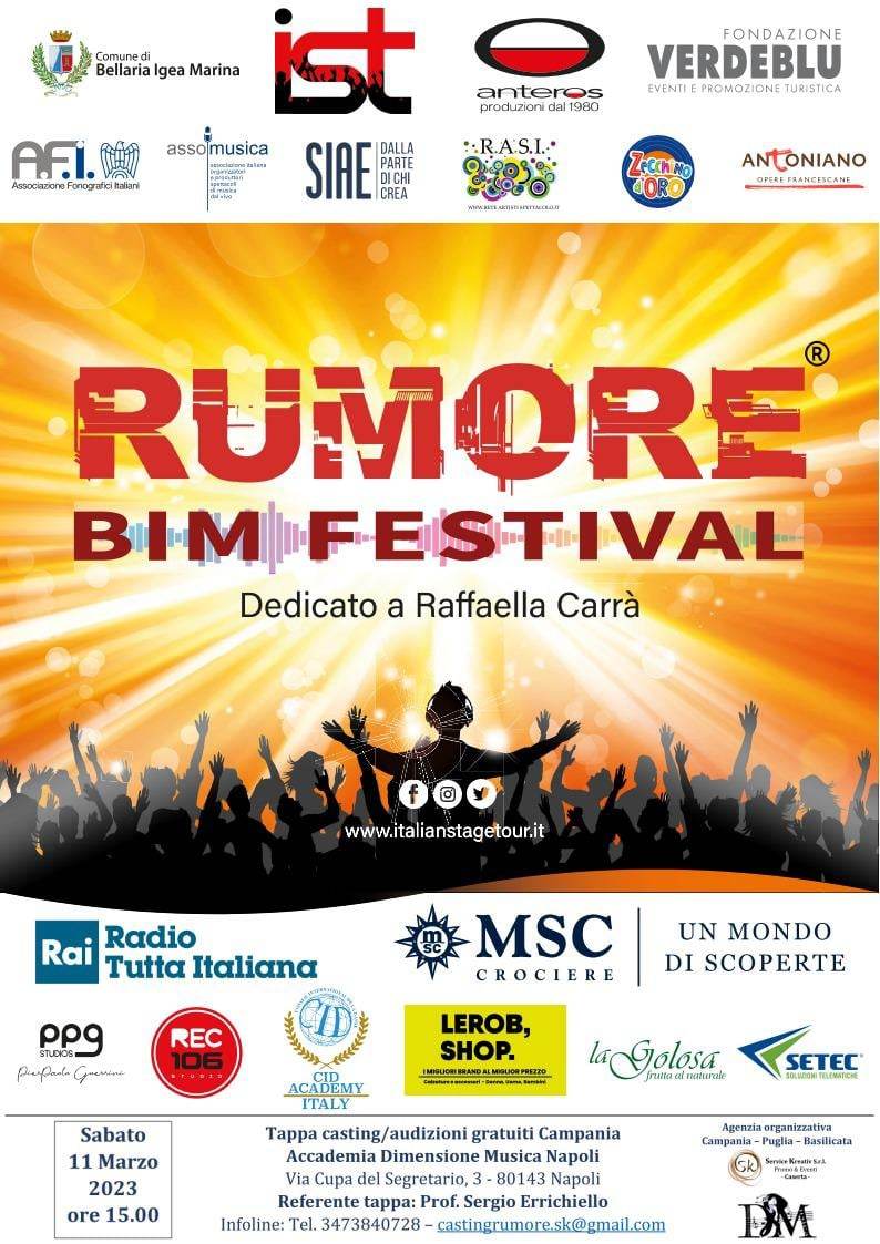 Si parte da Napoli sabato 11 marzo, prima tappa della Campania, presso l’Accademia Dimensione Musica in Via Cupa del Segretario, 3 alle ore 15.00,a cura di Sergio Errichiello. Valorizzare e promuovere i giovani del territorio, scoprire nuove strade, affidarli ad insegnanti del settore del canto, della musica, del ballo, della danza, della recitazione, interagire con loro per aiutarli a costruire il proprio futuro artistico. Questo, l’obiettivo di Rumore Bim Festival, che è rivolto ad artisti di ogni età, a partire dai sei anni in su. Un percorso di creatività, confronto e crescita,per farsi conoscere dagli addetti ai lavori e a cui non si può rinunciare.
