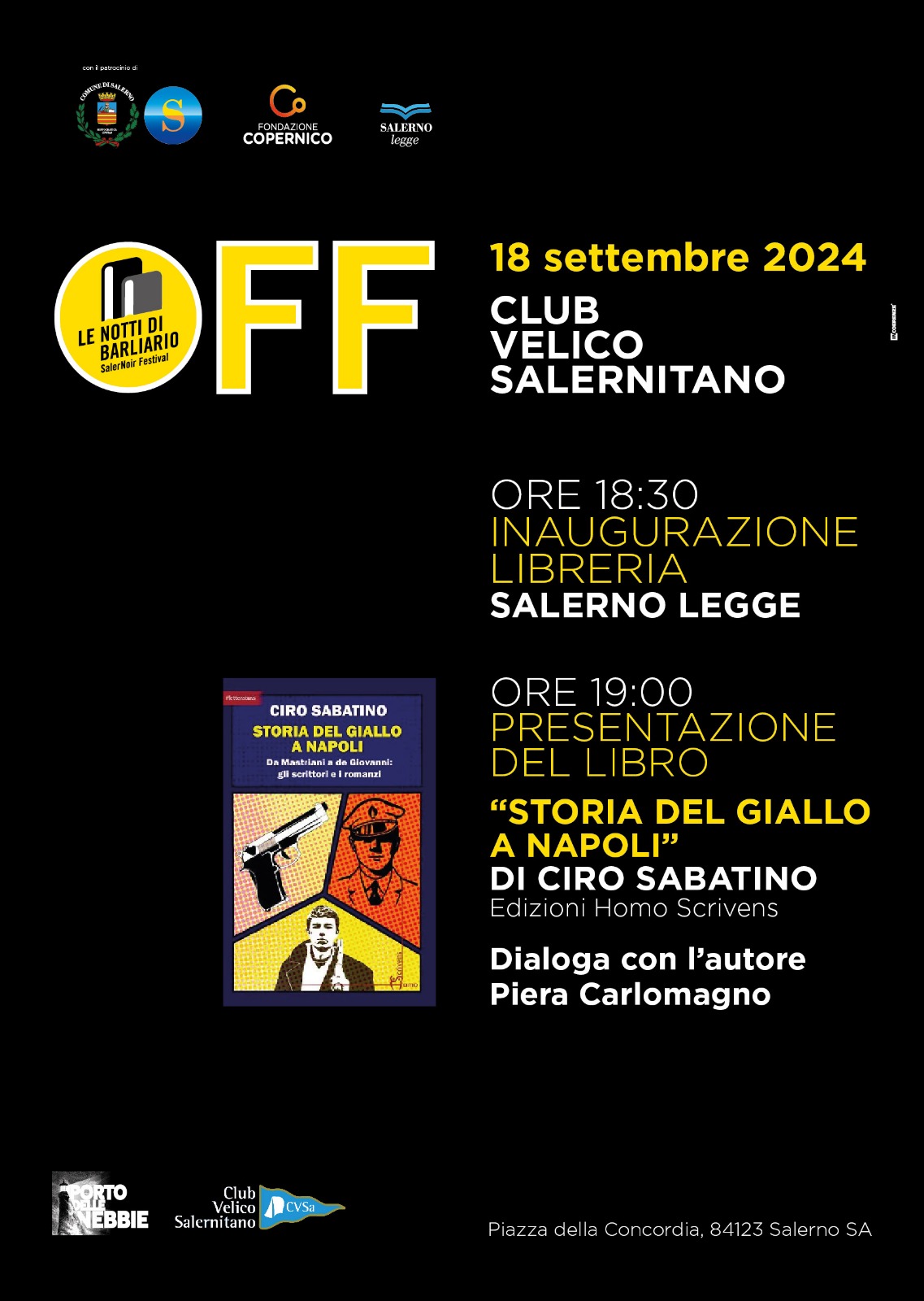 A seguire alle ore 19, ci sarà l’Evento off di SalerNoir Festival, con la presentazione del libro “Storia del giallo a Napoli” di Ciro Sabatino, Edizioni Homo Scrivens – Dialoga con l’autore, Piera Carlomagno.