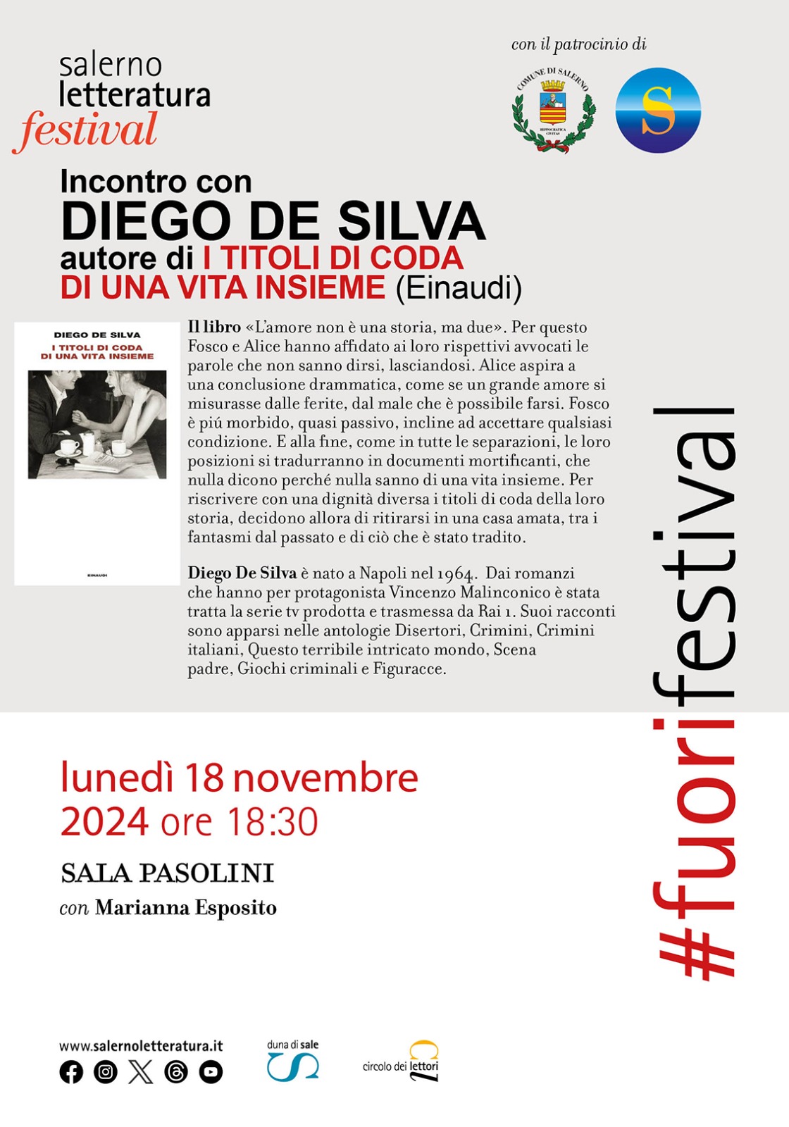 Nuovo appuntamento per il #Fuorifestival di Salerno Letteratura. Lunedì 18 novembre alle 18.30, negli spazi della Sala Pasolini, sarà ospite Diego De Silva, autore di “I titoli di coda di una vita insieme” (Einaudi). In dialogo con De Silva ci sarà Marianna Esposito.
