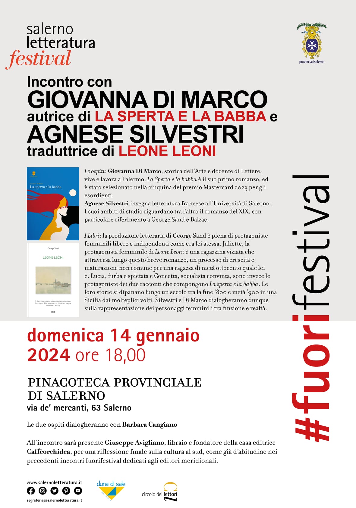 Nuovo appuntamento con il #Fuorifestival di Salerno Letteratura. Domenica 14 gennaio alle 18, negli spazi della Pinacoteca provinciale di via Mercanti, si terrà l’incontro con Giovanna Di Marco, autrice di “La sperta e la babba” e Agnese Silvestri, traduttrice di “Leone Leoni”. Le due ospiti dialogheranno con Barbara Cangiano. All’incontro sarà presente Giuseppe Avigliano, libraio e fondatore della casa editrice Cafèorchidea, per una riflessione finale sulla cultura al sud.