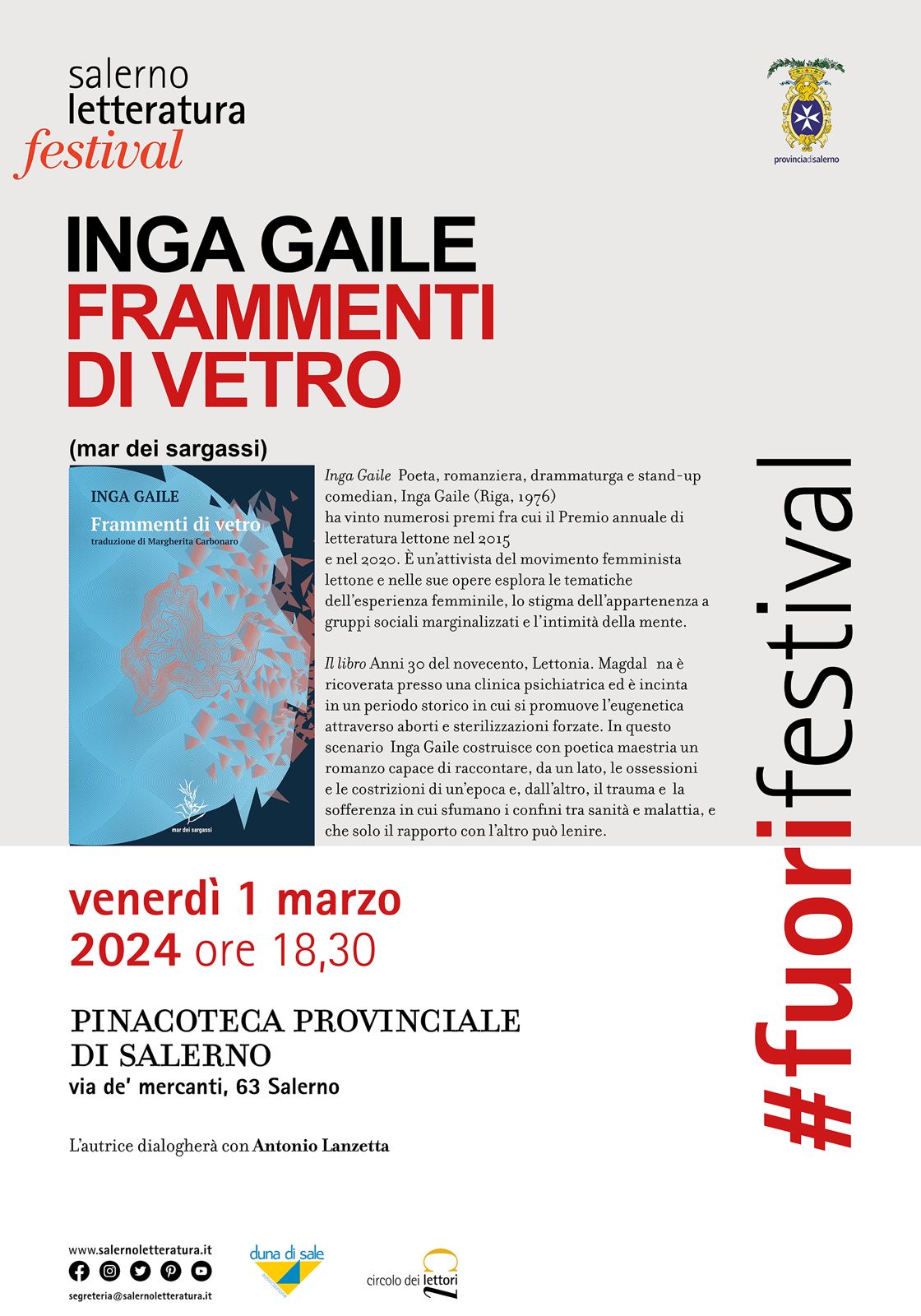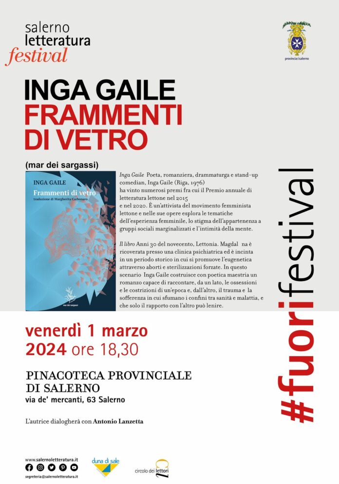 Nuovo appuntamento con i #Fuorifestival di Salerno Letteratura. Il 1 marzo alle 18.30, alla Pinacoteca provinciale di Salerno, in via Mercanti, si terrà l’incontro con Inga Gaile autrice di Frammenti di vetro (Mar Dei Sargassi). L’autrice sarà in dialogo con Antonio Lanzetta.