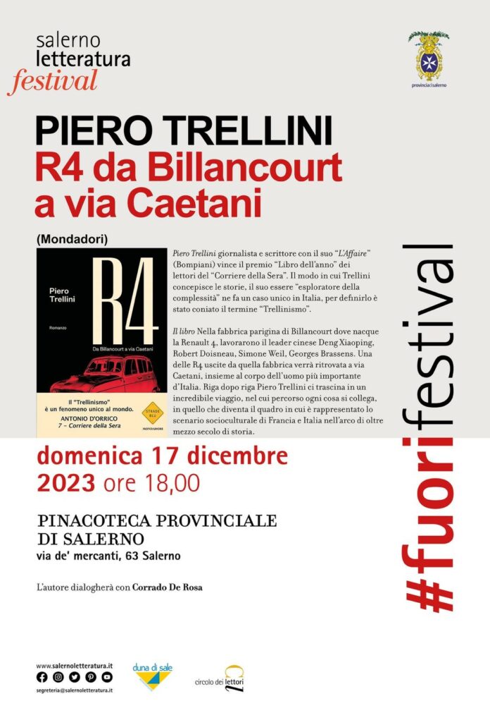 Nuovo appuntamento con il #Fuorifestival di Salerno Letteratura. Domenica 17 dicembre alle 18, presso gli spazi della Pinacoteca provinciale di via Mercanti, si terrà l’incontro con Piero Trellini, autore di “R4 – Da Billancourt a via Caetani” (Mondadori). In dialogo con l’autore ci sarà lo scrittore Corrado De Rosa.