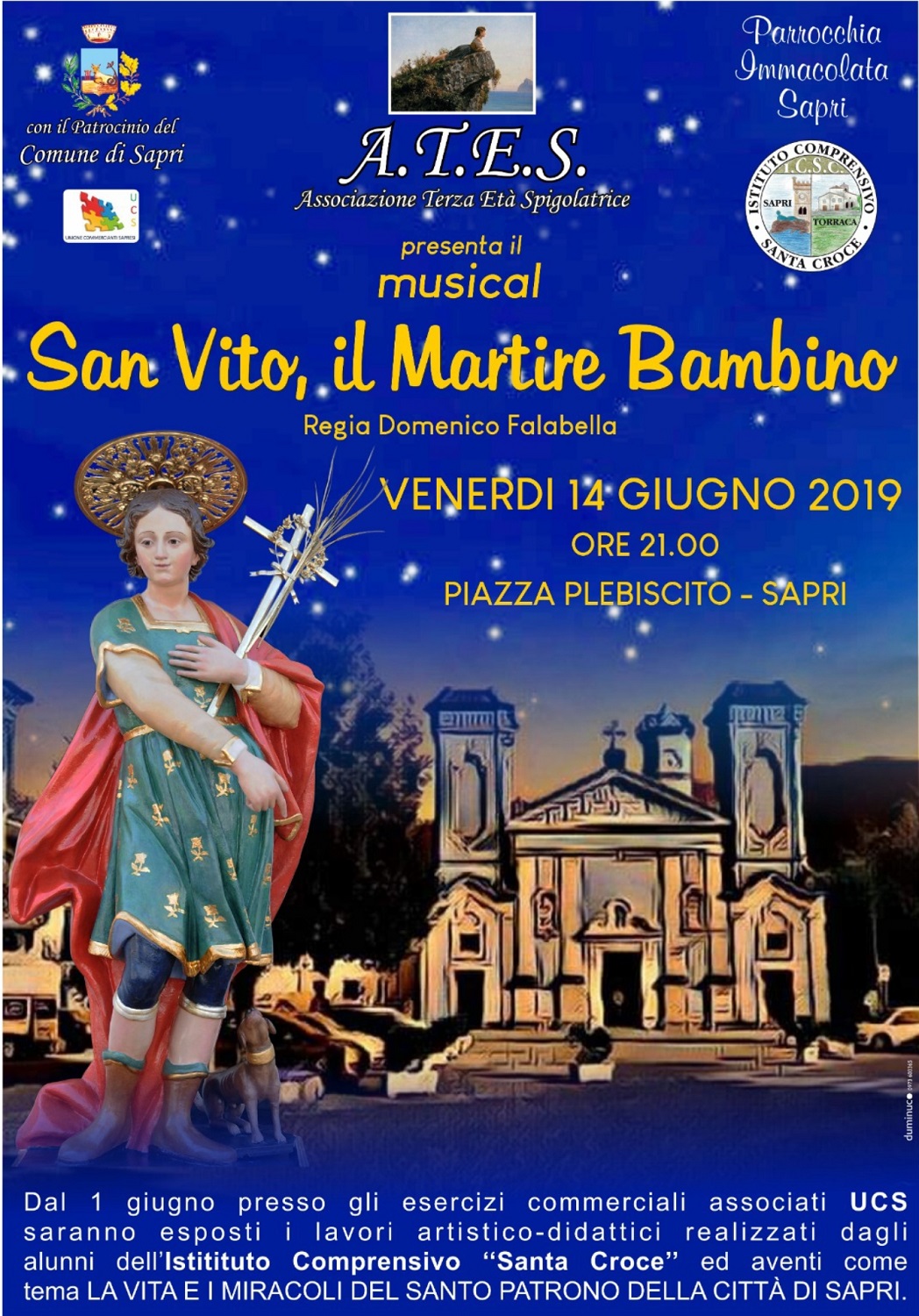 Nello specifico gli alunni delle classi dell’Istituto Comprensivo Santa Croce nel corso degli ultimi mesi hanno realizzato piccoli lavori artistici che raffigurano i vari momenti della vita del Santo e che saranno esposti per tutto il periodo antecedente la festa negli esercizi commerciali associati UCS di Sapri.