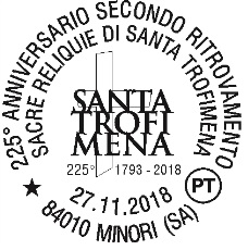 Poste Italiane informa che martedì 27 novembre, in occasione del “225° Anniversario Secondo Ritrovamento Sacre Relique di Santa Trofimena”, sarà disposto un servizio di annullo filatelico figurato, recante la dicitura: “225° Anniversario Secondo Ritrovamento Sacre Relique di Santa Trofimena – Santa Trofimena 225° 1793-2018 – 27/11/2018 – 84010 Minori (SA)”