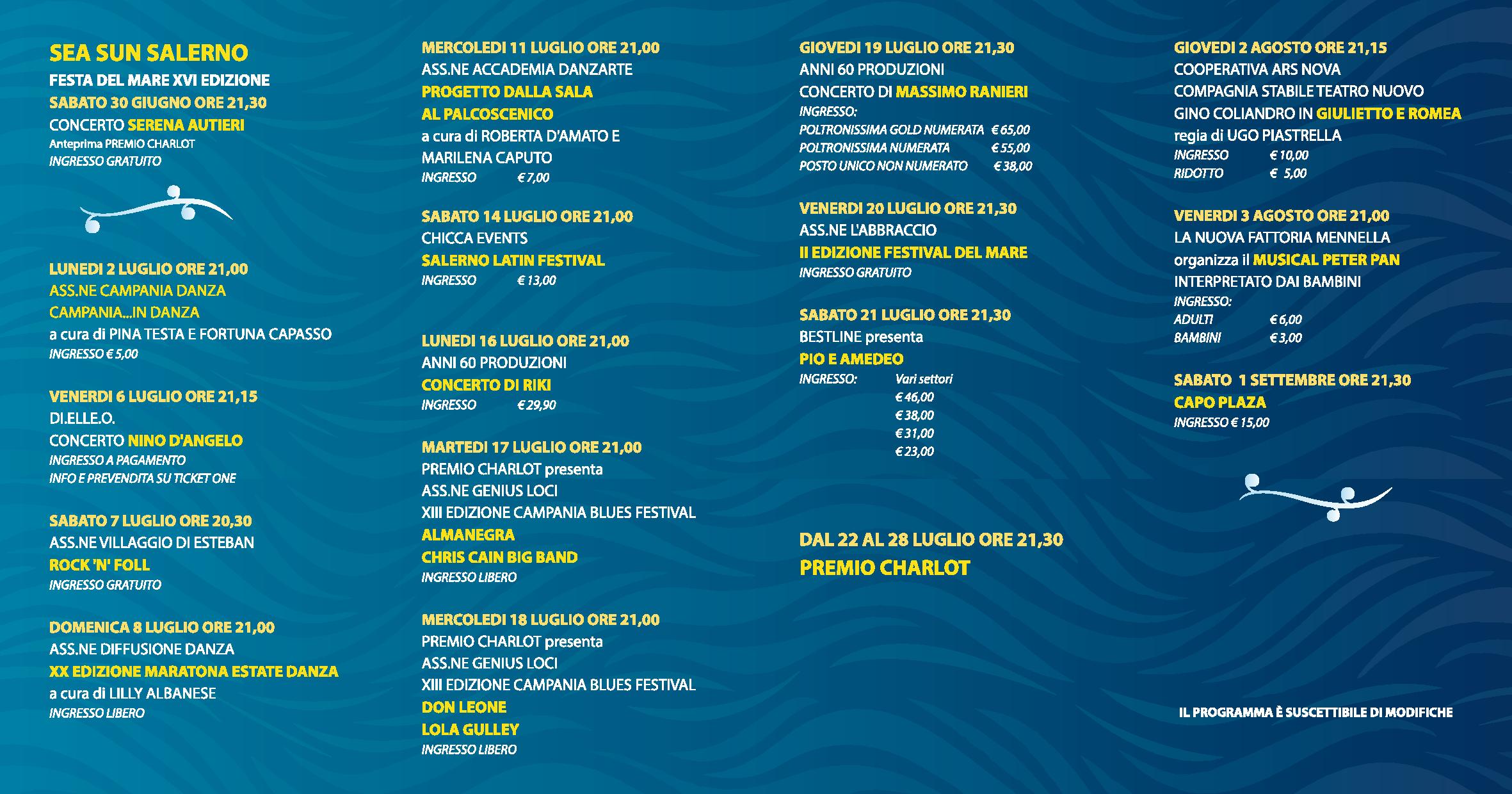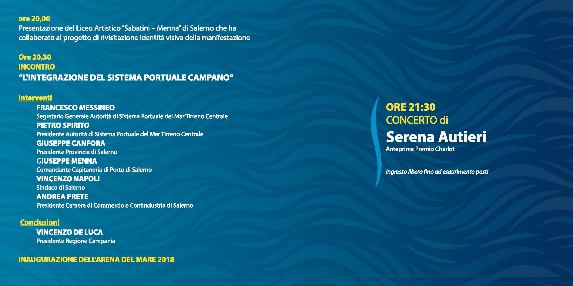 Al termine del dibattito l’attesa esibizione di Serena Autieri in concerto (ingresso libero e gratuito). Per tutta l’Estate 2018 si alterneranno all’Arena del Mare eventi, spettacoli, incontri. In programma tra gli altri gli spettacoli di Nino D’Angelo, Massimo Ranieri, Riki, Premio Charlot.