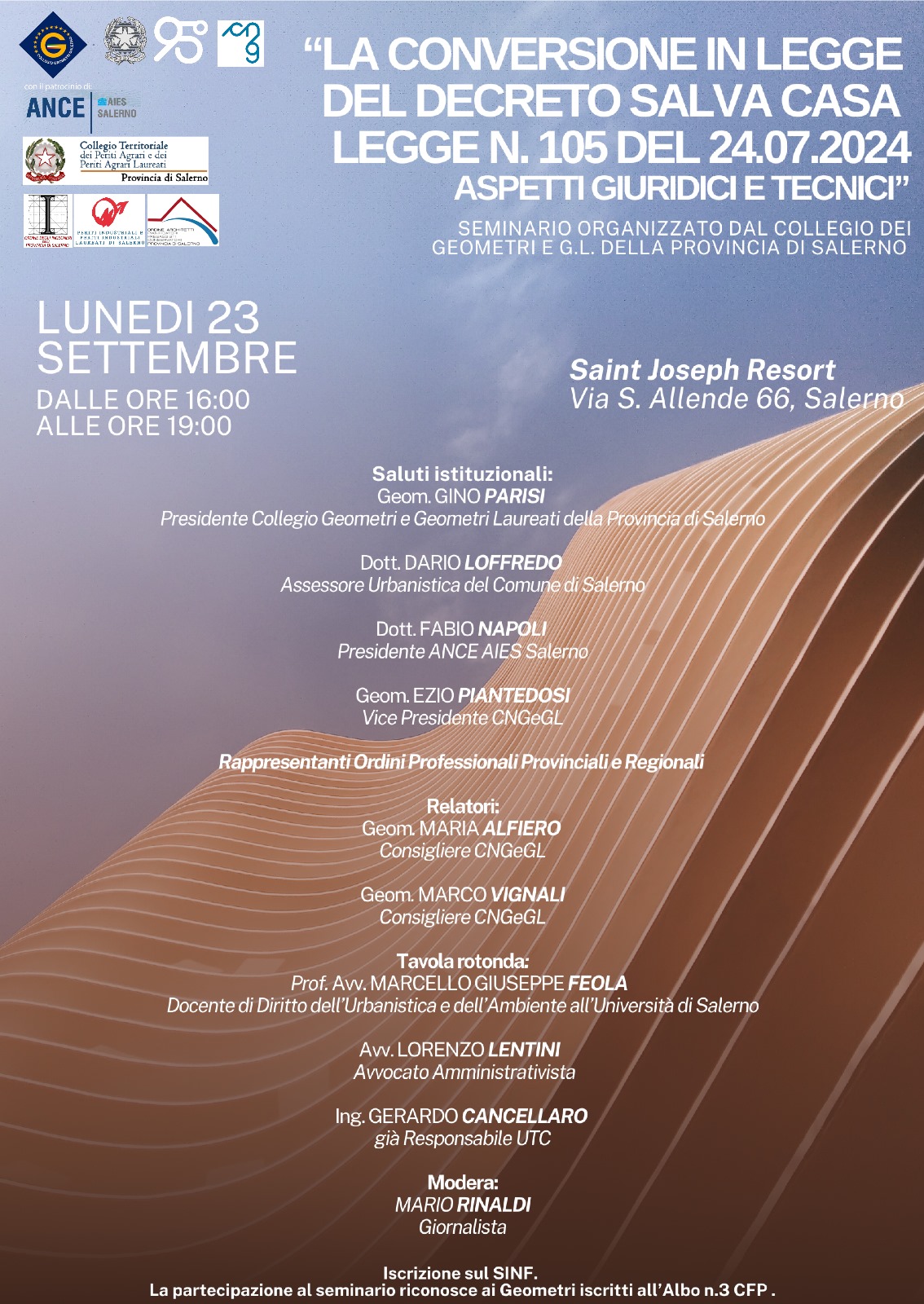 E’ diventato finalmente legge il Decreto Salva Casa, grazie alla conversione del testo avvenuta lo scorso 24 luglio. Per l’occasione il Collegio dei Geometri e Geometri Laureati di Salerno, presieduto da Gino Parisi ha organizzato un seminario dal titolo “La Conversione in Legge del Decreto Salva Casa Legge n. 105 del 24.07.2024 – Aspetti Giuridici e Tecnici”, che si terrà lunedì 23 Settembre 2024, dalle ore 16:00 alle ore 19:00 presso il Saint Joseph Resort in via Salvador Allende 66 a Salerno.