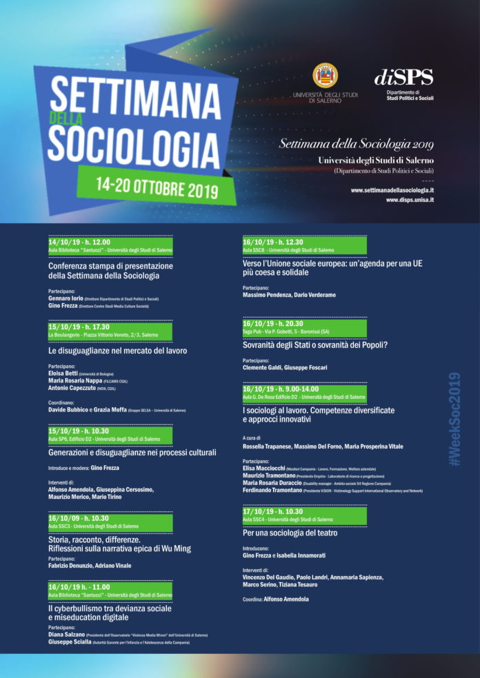Si è svolta stamattina la conferenza stampa di presentazione degli eventi organizzati dal Dipartimento di Studi Politici e Sociali (diSPS) dell’Università di Salerno nel quadro della terza edizione della kermesse Settimana della Sociologia.