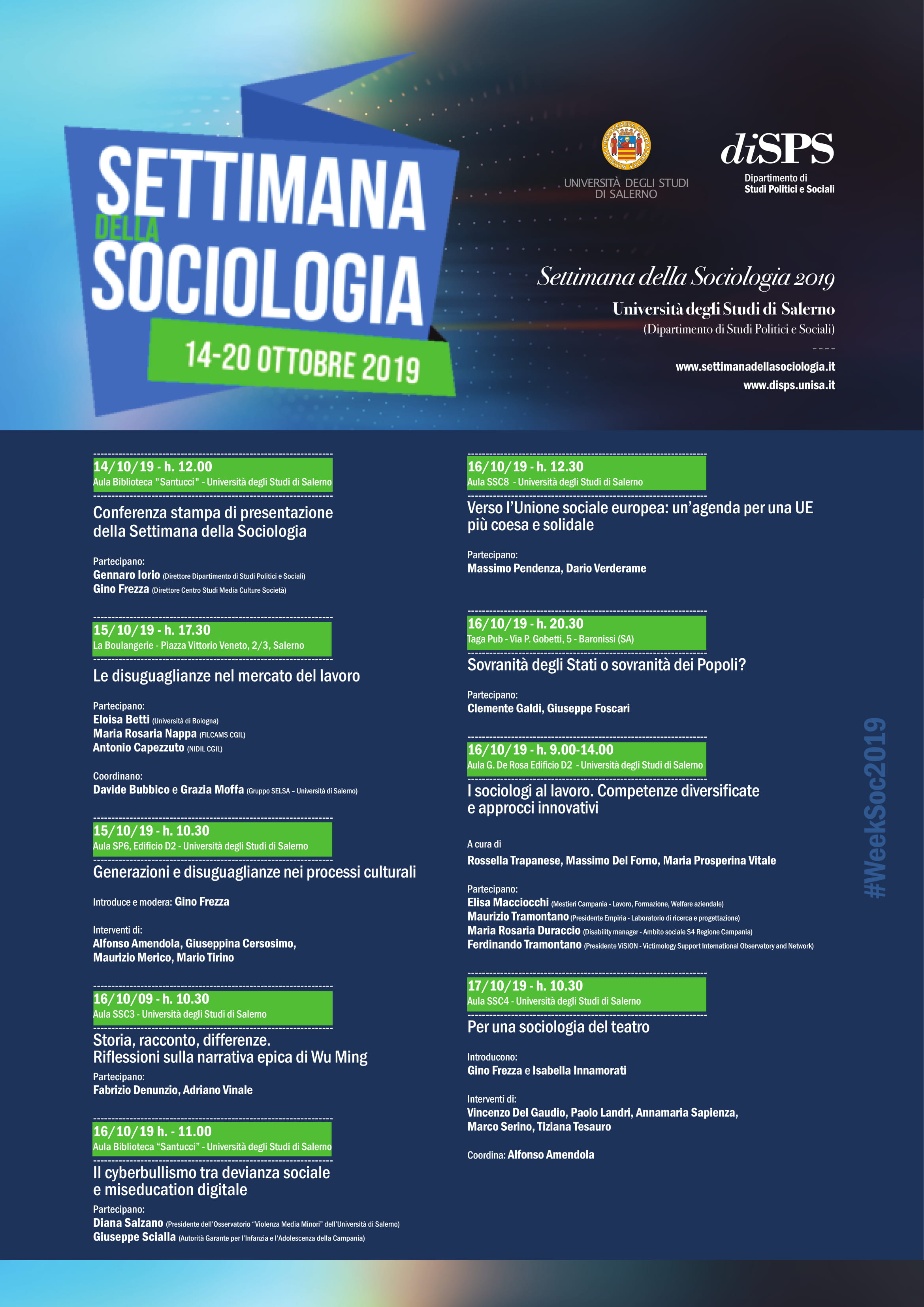 Ben cinque gli eventi in programma mercoledì 16 ottobre. Si inizia alle ore 9 (Aula “G. De Rosa”, Edificio D2) con il seminario “I sociologi al lavoro. Competenze diversificate e approcci innovativi”, curato dai docenti Massimo Del Forno, Rossella Trapanese e Maria Prosperina Vitale. L’evento è organizzato dall’Osservatorio delle Politiche Sociali del Dipartimento di Studi Politici e Sociali dell’Università di Salerno e nell’ambito del progetto POT9 GPS.UNI. Intervengono Elisa Macciocchi (Mestieri Campania – Lavoro, Formazione, Welfare aziendale) Maurizio Tramontano (Presidente Empiria – Laboratorio di ricerca e progettazione), Maria Rosaria Duraccio (Disability manager – Ambito sociale S4 Regione Campania), Ferdinando Tramontano (Presidente ViSION – Victimology Support International Observatory and Network). Si prosegue alle ore 10.30 con l’incontro “Storia, racconto, differenze. Riflessioni sulla narrativa epica di Wu Ming”, con gli interventi dei docenti Fabrizio Denunzio e Adriano Vinale. L’incontro si concentrerà sulle ragioni che hanno decretato l’affermazione di Wu Ming e, in particolare, sulla loro modalità differente di raccontare la Storia, con l’adozione della prospettiva dei subalterni.