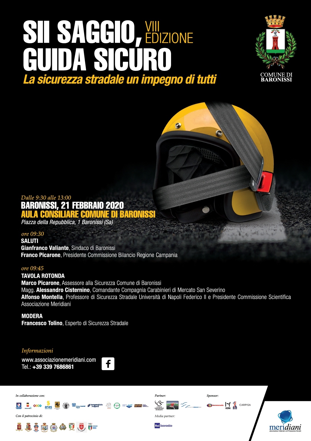 Alle ore 9,30 presso l’Aula Consiliare del Comune di Baronissi, Gianfranco Valiante, Sindaco di Baronissi e Franco Picarone, Presidente della Commissione Bilancio della Regione Campania, daranno il benvenuto a 250 studenti e docenti baroniensi, mentre Marco Picarone, Assessore alla Sicurezza del Comune di Baronissi, Alessandro Cisternino, Comandante della Compagnia dei Carabinieri di Mercato San Severino e Alfonso Montella, Professore di Sicurezza Stradale Università di Napoli Federico II e Presidente della Commissione Scientifica dell’Associazione Meridiani, illustreranno le principali regole dettate dal codice della strada e l’importanza di assumere un corretto comportamento da pedoni, passeggeri e ciclisti. Coordinerà i lavori, Francesco Tolino, Esperto di Sicurezza Stradale.