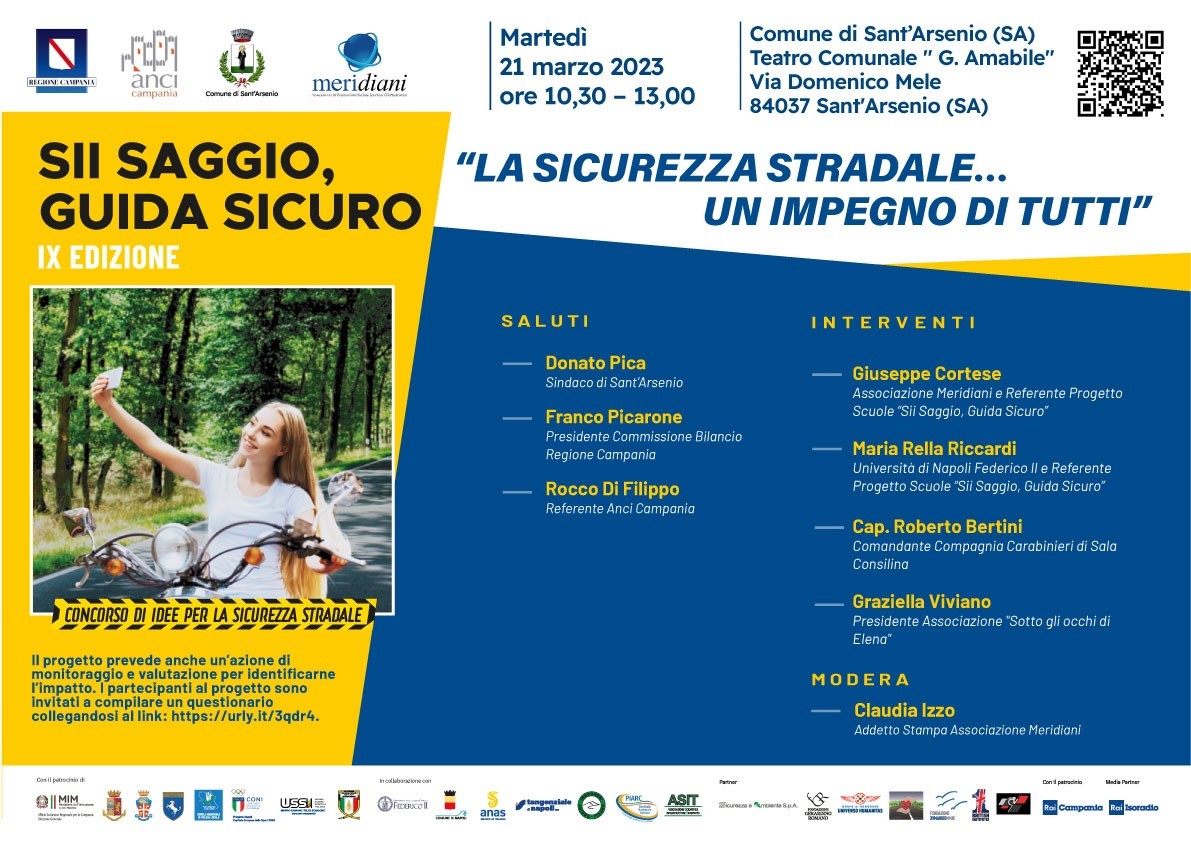 #siisaggioguidasicuro è un progetto sulla sicurezza stradale promosso dalla Regione Campania e attuato dall’Anci Campania con la collaborazione dell’Associazione Meridiani e la partecipazione del personale dell’Università degli Studi di Napoli Federico II, dell’Anas, dell’Ordine degli Ingegneri della provincia di Napoli, di PIARC – Associazione Mondiale della Strada, dell’Associazione Scientifica Infrastrutture Trasporto, del patrocinio del Ministero dell’Istruzione e del Merito, della Polizia di Stato, dell’Arma dei Carabinieri, della Guardia di Finanza, della Scuola Regionale della Polizia Locale, del CONI – Comitato Regionale Campania, Ussi – Unione Stampa Sportiva Italiana e dell’Associazione Nazionale dei Vigili del Fuoco; della media partnership di Rai Campania e Rai Isoradio.