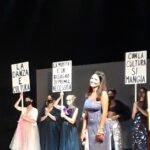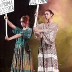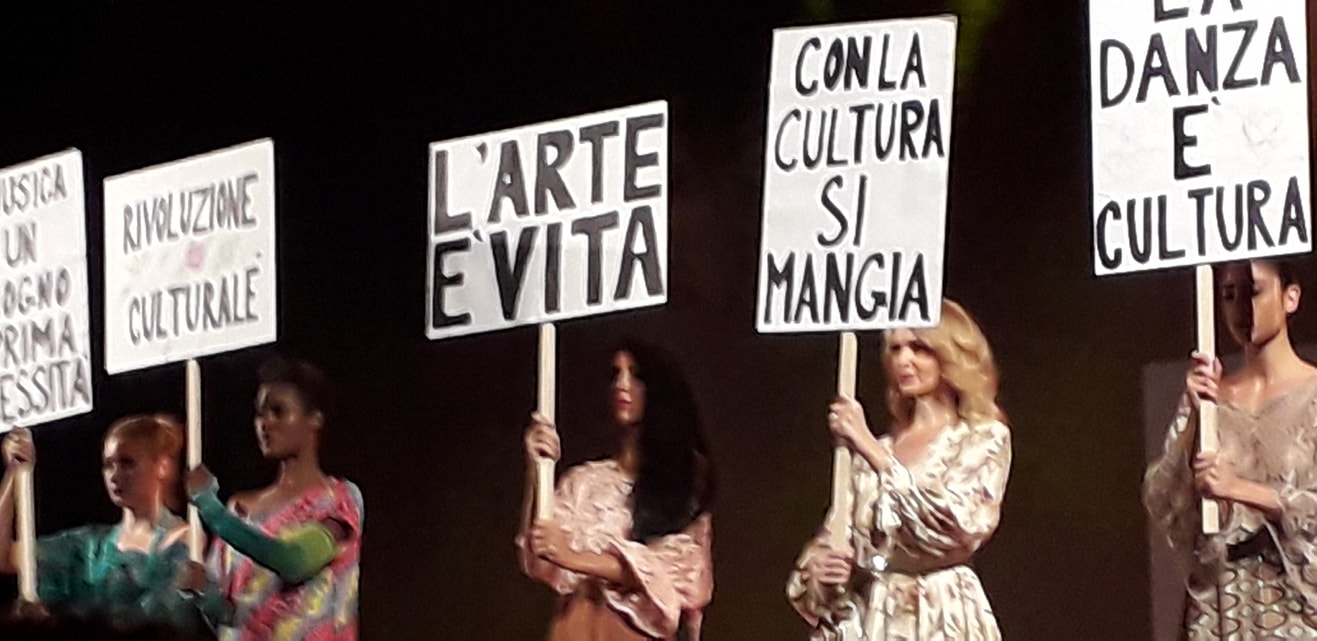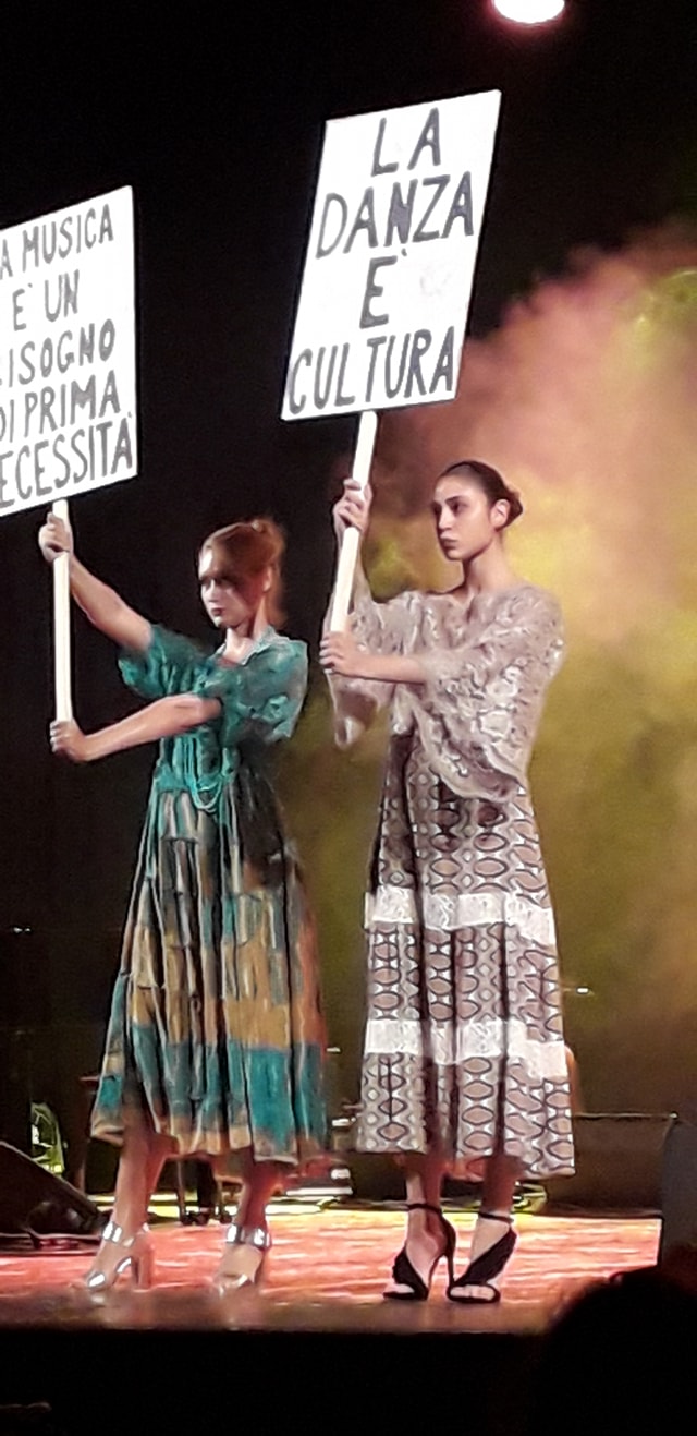 Con la lettura dell’art. 4 della Costituzione Italiana apre il sipario con eleganza e talento la giornalista Concita De Luca per offrire la scena le splendide modelle di Peppe Volturale con abiti singolari e cartelli che parlano con i loro corpi esili e statuari, per ricordare al pubblico diritti negati e voglia di ricominciare , rivoluzionando la storia dello spettacolo con altre forme e colori possibili di rinascita.