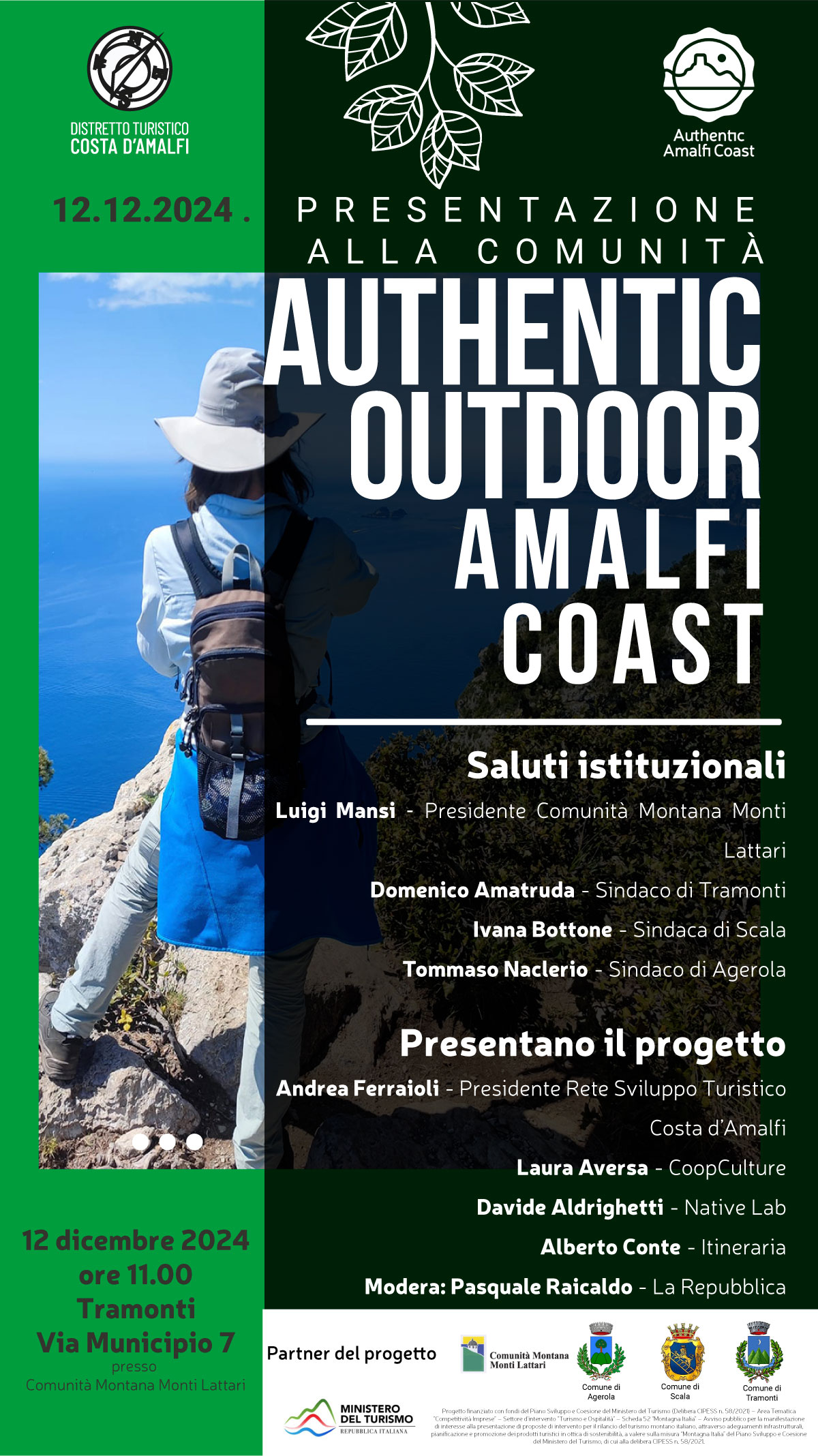 Giovedì 12 dicembre 2024, alle ore 11:00, presso la sede della Comunità Montana Monti Lattari a Tramonti, si terrà la presentazione ufficiale alla comunità della Costa d’Amalfi del progetto Authentic Outdoor Amalfi Coast, un’iniziativa innovativa che segna il primo passo concreto verso il decongestionamento dei flussi turistici nella Divina.