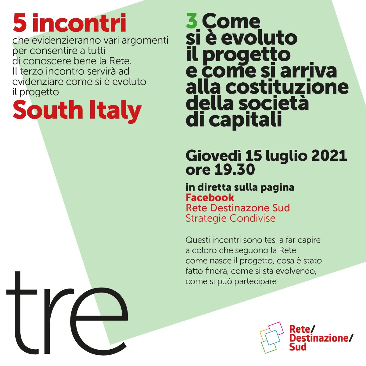 Rete Destinazione Sud ha organizzato in data giovedì 15 luglio 2021 alle ore 19:30 un’incontro in diretta streaming dal titolo “South Italy: Come si è evoluto il progetto e come si arriva alla Costituzione della Società di Capitali” che verrà trasmesso sulla pagina Facebook “Rete Destinazione Sud – Strategie Condivise.”