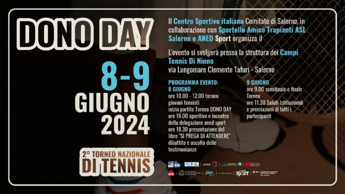 Il Centro Sportivo Italiano Comitato di Salerno, in collaborazione con lo Sportello Amico Trapianti e l’ U.O.S.D. Promozione della Salute dell’Asl Salerno, organizza il 2° Torneo Dono day, torneo di tennis amatoriale che vedrà impegnati gli atleti della Nazionale di Tennis Trapiantati dell’ANED Sport ,reduci da numerose medaglie vinte ai mondali di Perth 2023, che girano l’Italia e il mondo per testimoniare come dopo il trapianto si possa avere nuovamente una vita piena e ricca di soddisfazioni.