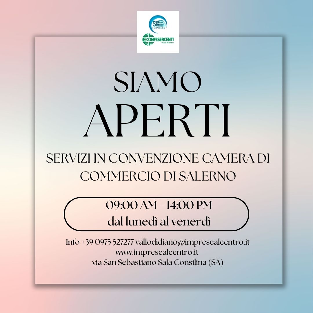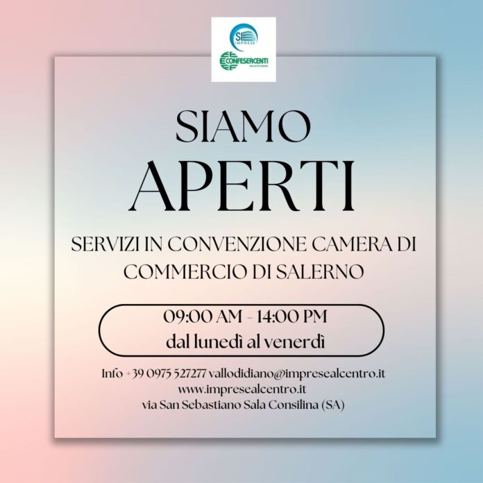 Confesercenti Vallo di Diano, con sede in via San Sebastiano a Sala Consilina, è raggiungibile anche all’email vallodidiano@impresealcentro.it, al numero +39 0975 52 72 77 o consultando il sito internet www.impresealcentro.it.