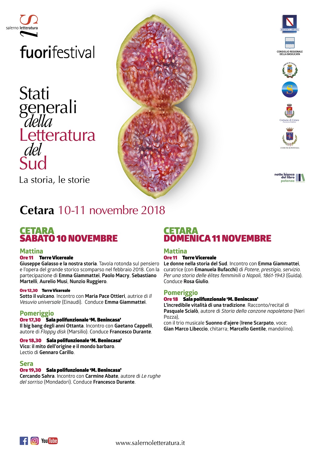 GLI APPUNTAMENTI. La rassegna, che si è aperta giovedì 8 a Potenza, per proseguire a Salerno, farà tappa domani a Cetara. Sabato 10, alle 11, presso la Torre Vicereale, si terrà una tavola rotonda sul pensiero e l’opera di Giuseppe Galasso con la partecipazione di Emma Giammattei, Paolo Macry, Sebastiano Martelli, Aurelio Musi, Nunzio Ruggiero. Alle 12.30, sarà invece la volta di Maria Pace Ottieri, autrice de “Il Vesuvio universale” (Einaudi). Conduce Emma Giammattei. Nel pomeriggio, alle 17.30, la Sala polifunzionale M.Benincasa aprirà le porte a Gaetano Cappelli, autore di “Floppy disk” (Marsilio). Conduce Francesco Durante. Alle 18.30, la lectio di Gennaro Carillo su Vico, mentre alle 19.30, Carmine Abate presenterà, in compagnia di Francesco Durante, “Le rughe del sorriso” (Mondadori). Domenica 11 si riparte da Cetara, alle 11, presso la Torre Vicereale, con Emma Giammattei, curatrice con Emanuela Bufacchi di “Potere, prestigio, servizio. Per una storia delle èlites femminili a Napoli 1861-1943” (Guida). Conduce Rosa Giulio. Si conclude alle 18, nella Sala polifunzionale M.Benincasa, col racconto-recital di Pasquale Scialò.