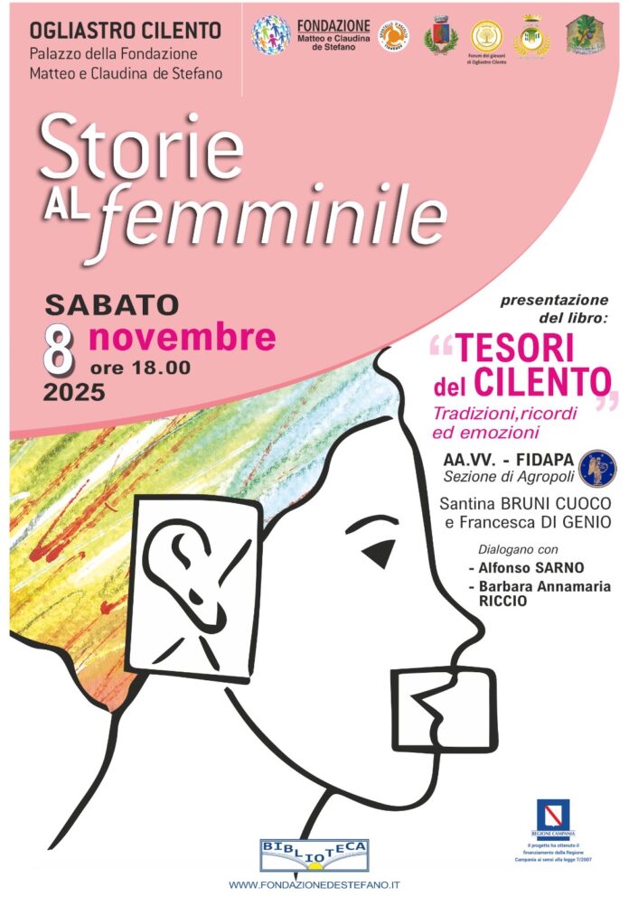 «Con la rassegna “Storie al Femminile” la fondazione intende dare voce a percorsi di vita e di cultura che valorizzano l’apporto delle donne alla costruzione della memoria collettiva del Cilento» – spiega Barbara Riccio, presidente della Fondazione Matteo e Claudina de Stefano. «Ogni incontro è un’occasione per rinnovare il legame tra storia, comunità e territorio, in una prospettiva di crescita culturale condivisa». Attraverso “Tesori del Cilento”, le autrici offrono uno sguardo autentico e appassionato sul patrimonio materiale e immateriale della loro terra, fatto di ricordi, racconti e antiche tradizioni. «Questo libro è un atto d’amore verso il nostro territorio e verso le donne che lo abitano» – sottolinea Francesca Di Genio – «Abbiamo voluto restituire voce a storie spesso taciute, ma fondamentali per comprendere chi siamo e da dove veniamo». «Ogni pagina è un frammento di memoria che diventa emozione condivisa» – aggiunge Santina Bruni Cuoco. «Il nostro intento è stato quello di unire le esperienze e le sensibilità di tante donne, per costruire insieme una narrazione viva del Cilento e della sua identità». L’incontro offrirà l’occasione per riflettere sul ruolo delle donne come custodi di tradizioni e promotrici di cultura. La rassegna “Storie al Femminile” conferma così la sua vocazione di spazio di dialogo, conoscenza e valorizzazione del territorio, dove la parola delle donne diventa strumento di rinascita e di connessione tra passato e futuro. L’ingresso all’appuntamento è libero.
