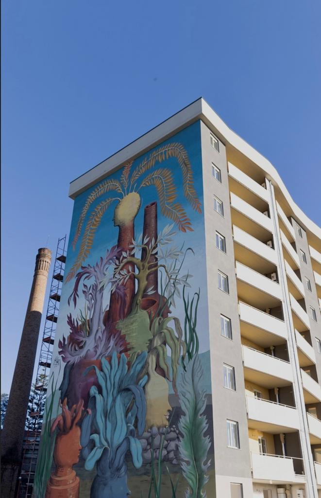 Altro artista coinvolto nel progetto Spineta è Andrea Parente, detto Alleg, di origine abruzzese, cresciuto fin da giovanissimo nel movimento del muralismo, la cui poetica fonde oggetti quotidiani e natura, reinterpretati in chiave onirica. Anche il mito riveste uno spazio predominante, così come già accaduto durante precedenti interventi in tutta Italia, idem la letteratura: sua la visionaria idea di trascrivere Fontamara di Ignazio Silone su un muro, per celebrare, in occasione dei quarant’anni dalla scomparsa, il grande scrittore italiano. L’opera pensata per il nuovo insediamento abitativo di Pontecagnano è intitolata “Giardino umano” ed è figlia dell’idea di voler mettere in relazione passato e presente. Nel luogo in cui un tempo sorgeva una ciminiera, oggi un complesso residenziale diventa un hub a cielo aperto capace di incentivare le relazioni sociali nel massimo rispetto dell’ambiente. Le piante che attraversano volti, quasi accarezzandoli, ridanno centralità alla figura dell’essere umano, artefice di ogni cambiamento che possa generare armonia.