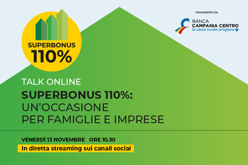 Il nuovo appuntamento, dal titolo “Superbonus 110%: un’occasione per famiglie e imprese”, è in programma venerdì 13 novembre, a partire dalle ore 10,30. Il talk, trasmesso in diretta sui canali social, rappresenterà l’occasione per fare chiarezza sull’agevolazione prevista dal Decreto Rilancio alla presenza dei presidenti di ordini professionali ed esperti della Banca. I relatori, con un linguaggio semplice e comprensibile per tutti, approfondiranno gli aspetti più significativi legati al Superbonus rivolgendosi a famiglie, aziende e amministratori di condominio.