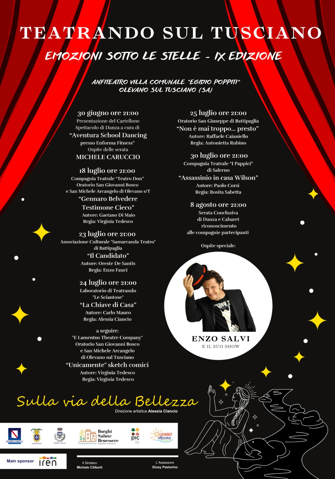 Si apre il sipario della Nona edizione della manifestazione teatrale all’aperto organizzata dal Comune di Olevano sul Tusciano. Sabato 30 giugno, alle ore 21:00, nella villa comunale “Egidio Poppiti” di Olevano sul Tusciano aprirà il cartellone lo spettacolo di danza “Aventura School Dancing” delle maestre di ballo Krizia Galiano e Debora Gioia. Ospite della serata Michele Caruccio, voce emergente di Olevano sul Tusciano.